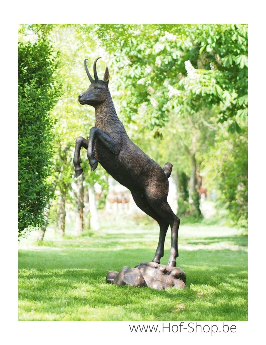 Cette sculpture en bronze d'un chamois, plus vraie que nature, fait une belle apparition dans un grand jardin.