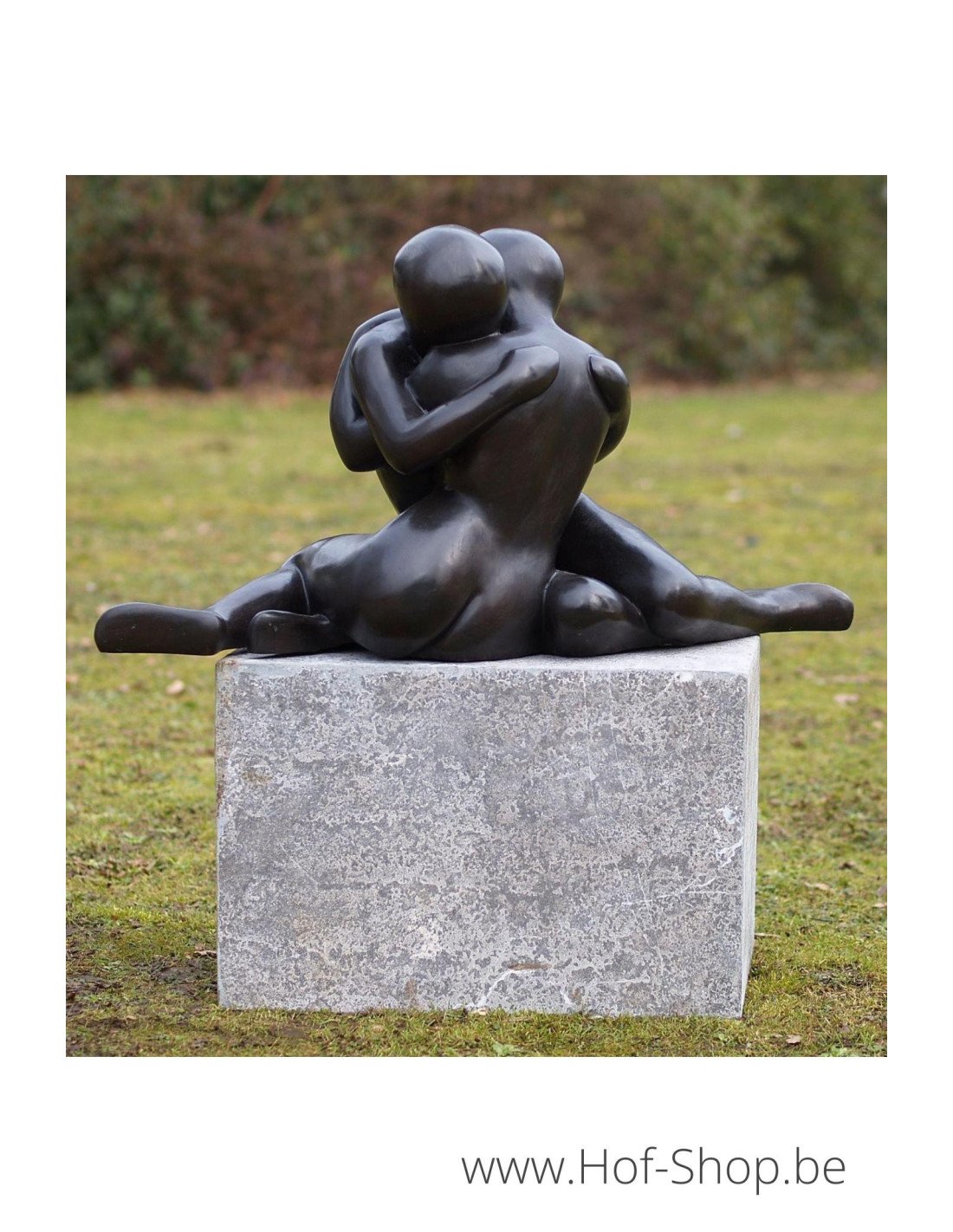 Cette statue en bronze représente l'étreinte intime d'un couple d'amoureux. Une belle statue en bronze représentant deux personnages nus dans un décor moderne.