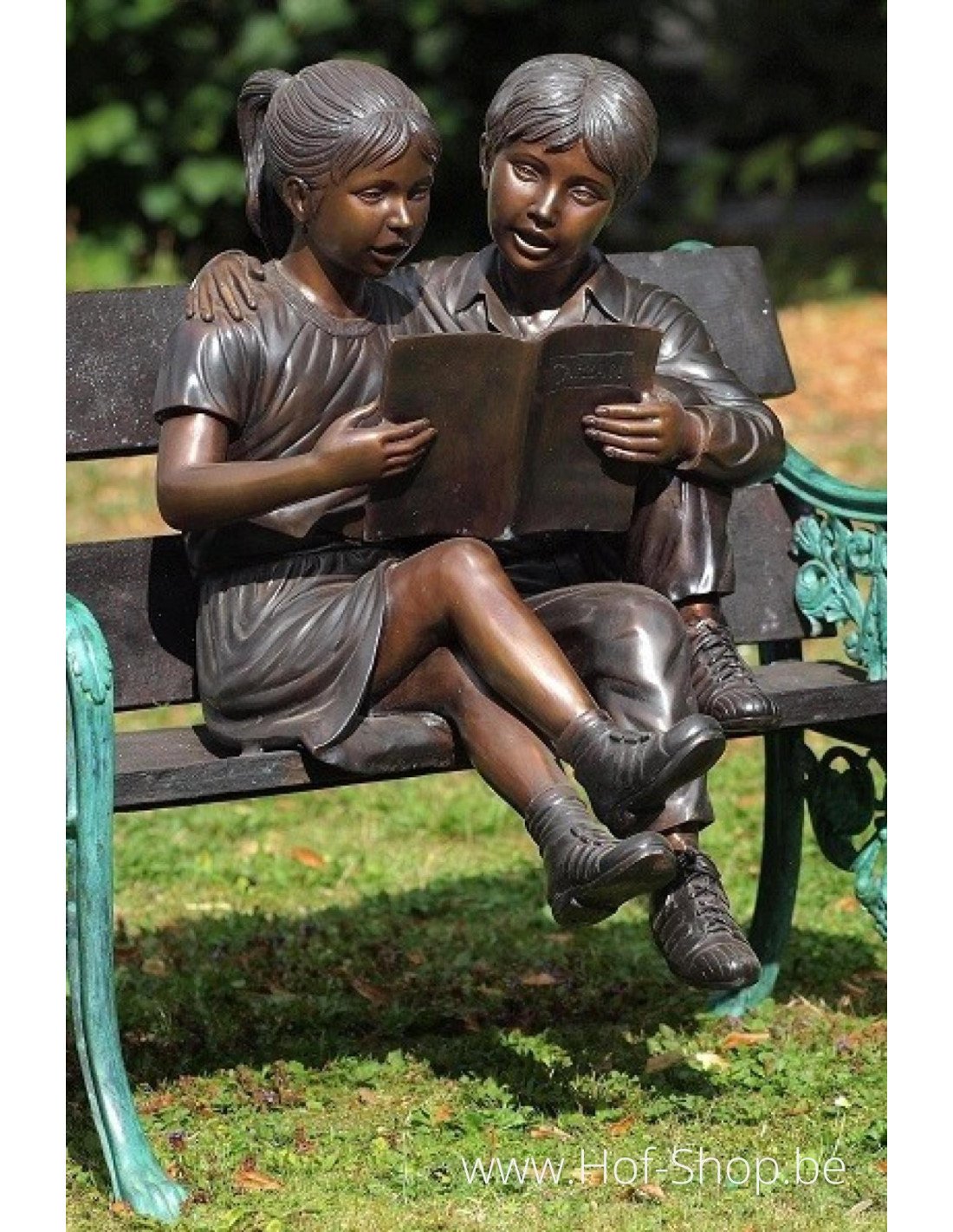 De beaux enfants de bronze qui lisent un livre ensemble sur un banc.