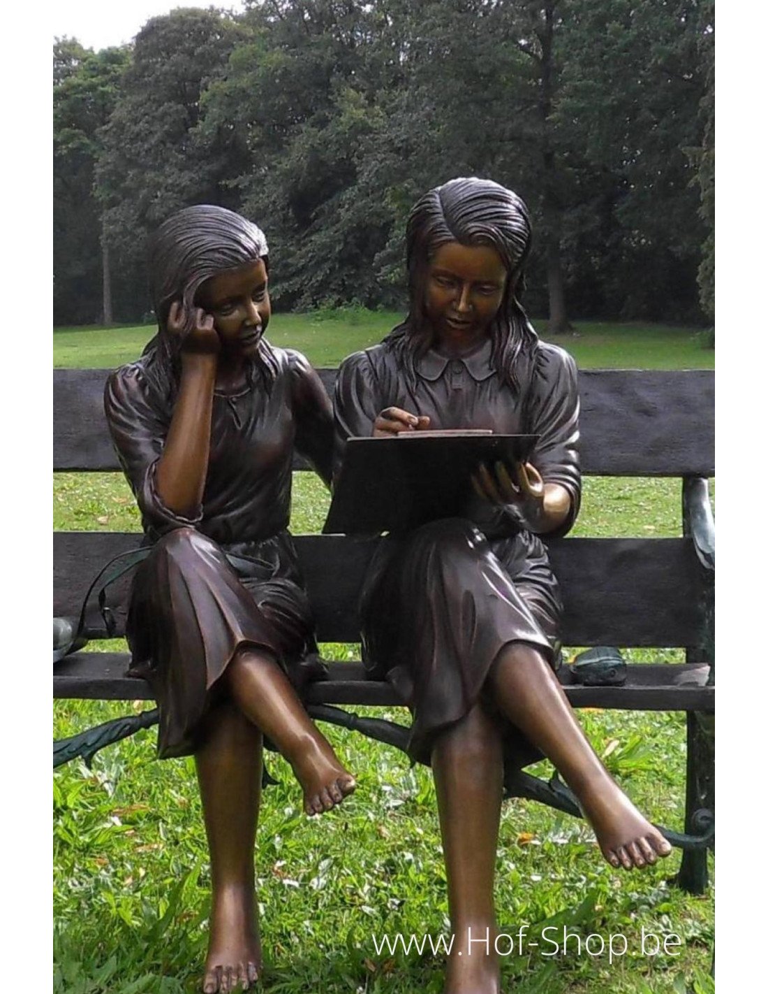 Cette statue en bronze, finement détaillée, représentant deux fillettes lisant, attire le regard dans un jardin. Les fillettes sont assises sur un banc.