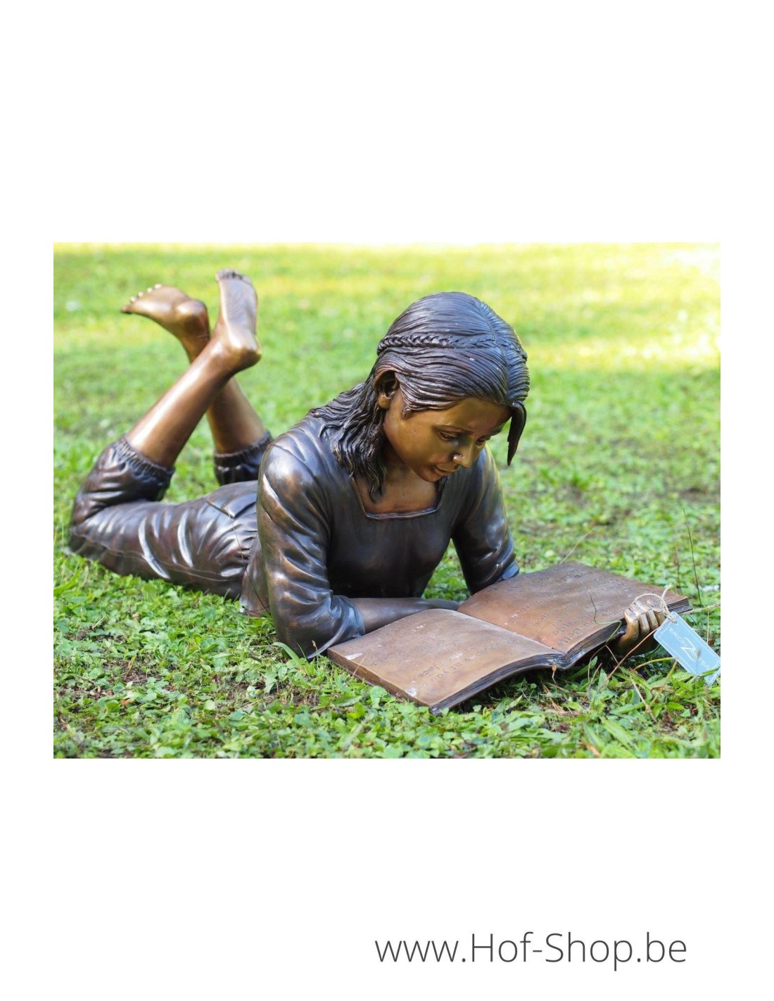 Cette figurine magnifiquement détaillée d'une fille allongée qui lit est un joli accroche-regard dans n'importe quel jardin ou intérieur. L'enfant a une patine mordorée.