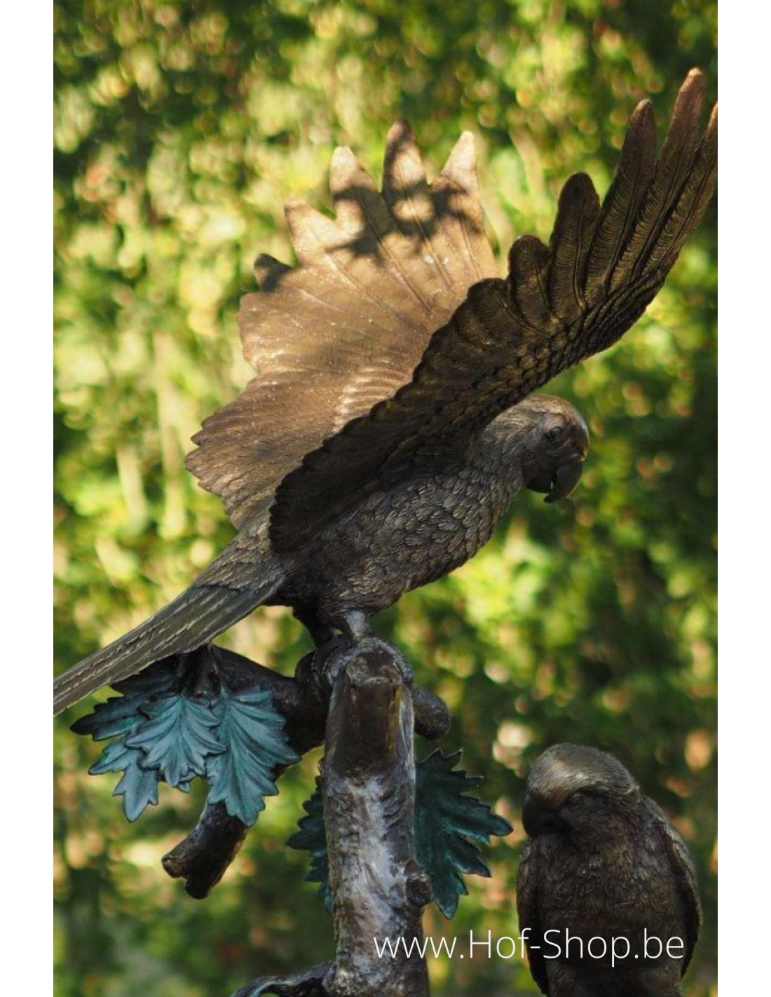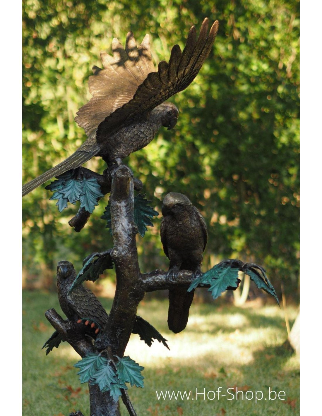 Trois perroquets en bronze sur un tronc d'arbre. Un bel objet décoratif dans le jardin.