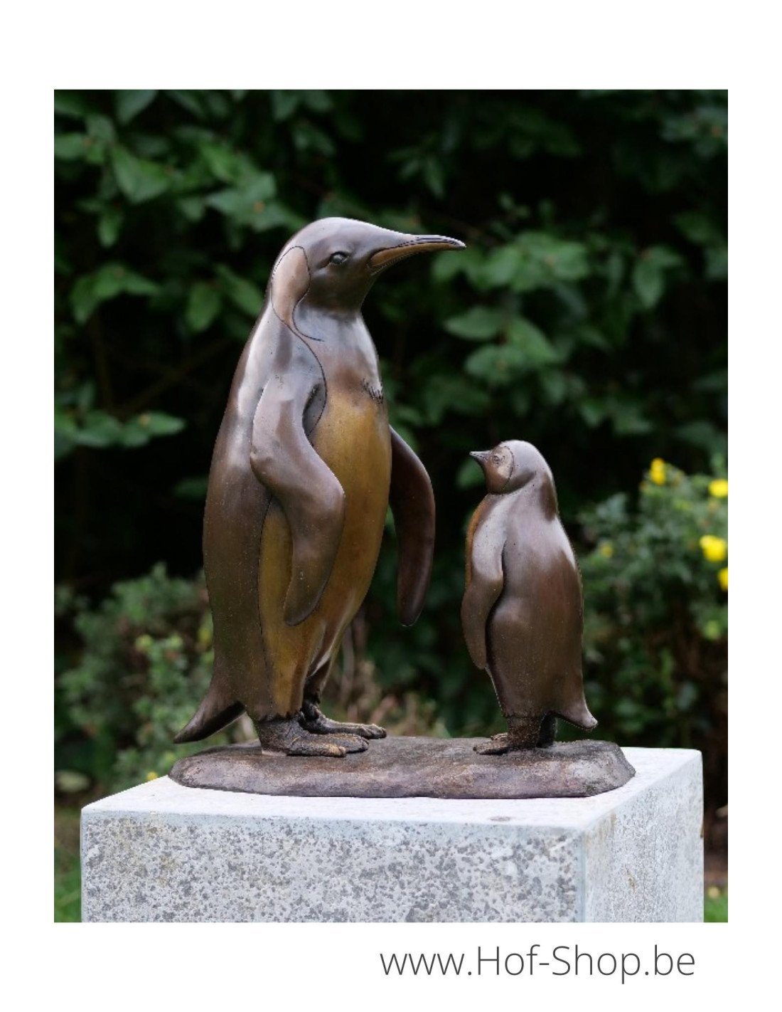 Cette sculpture en bronze d'un pingouin et bébé, plus vraie que nature, fait une belle apparition dans un grand jardin.