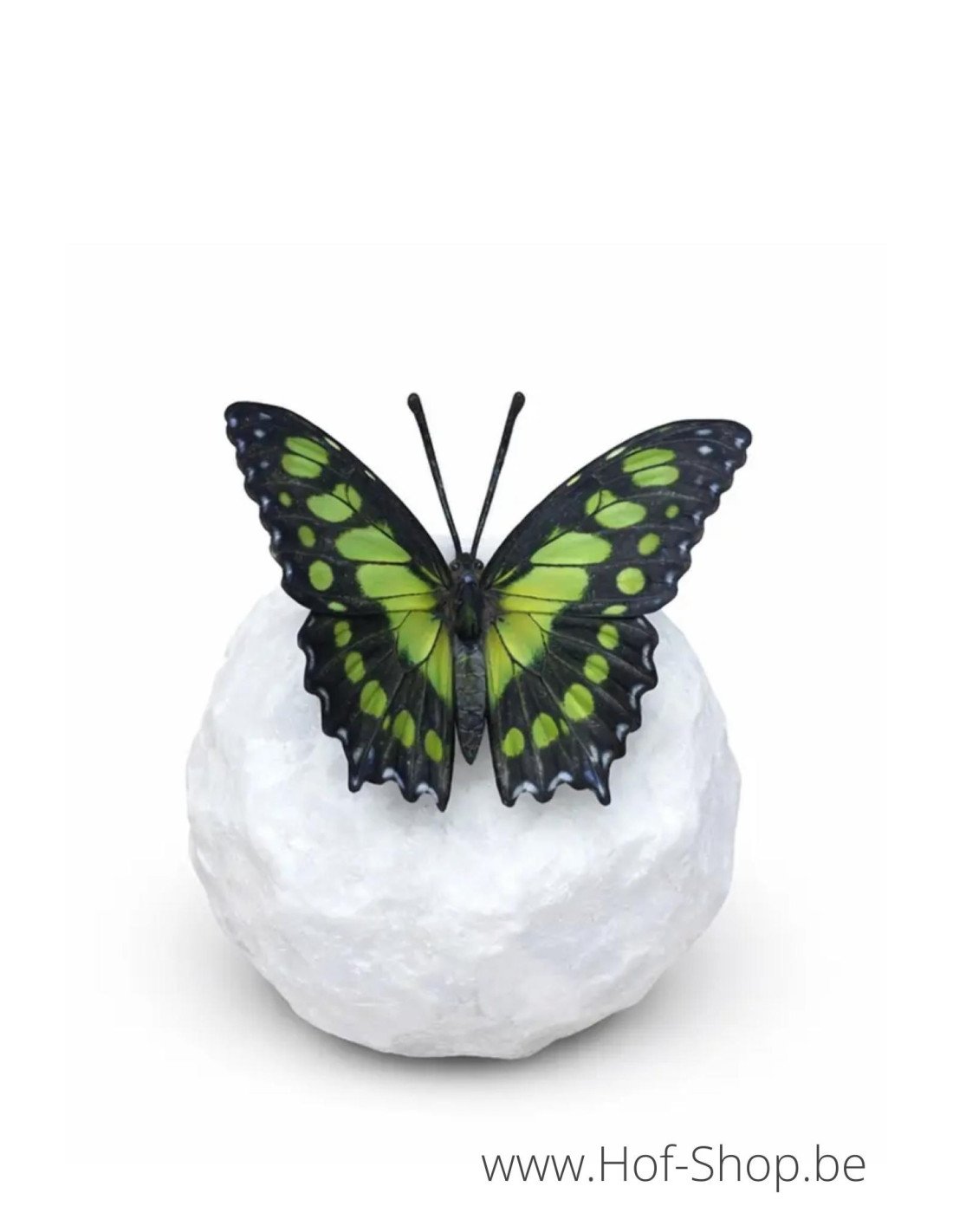 Magnifique sculpture de jardin en bronze représentant un papillon en malachite sur une pierre naturelle. Collectionnez-les toutes.