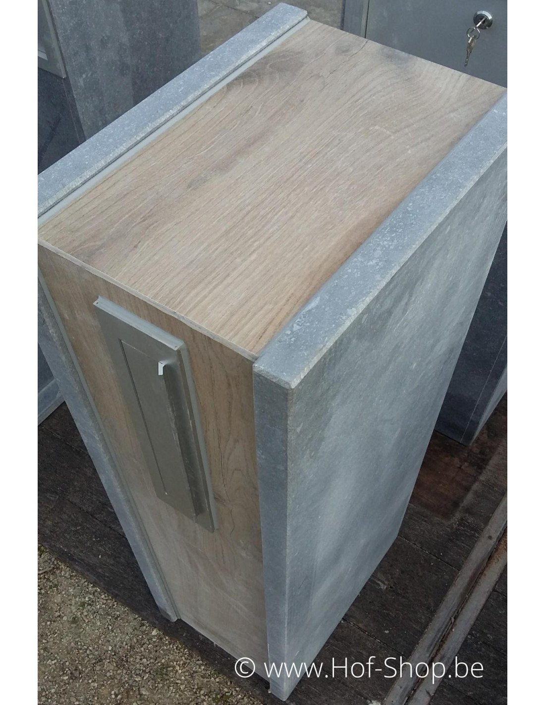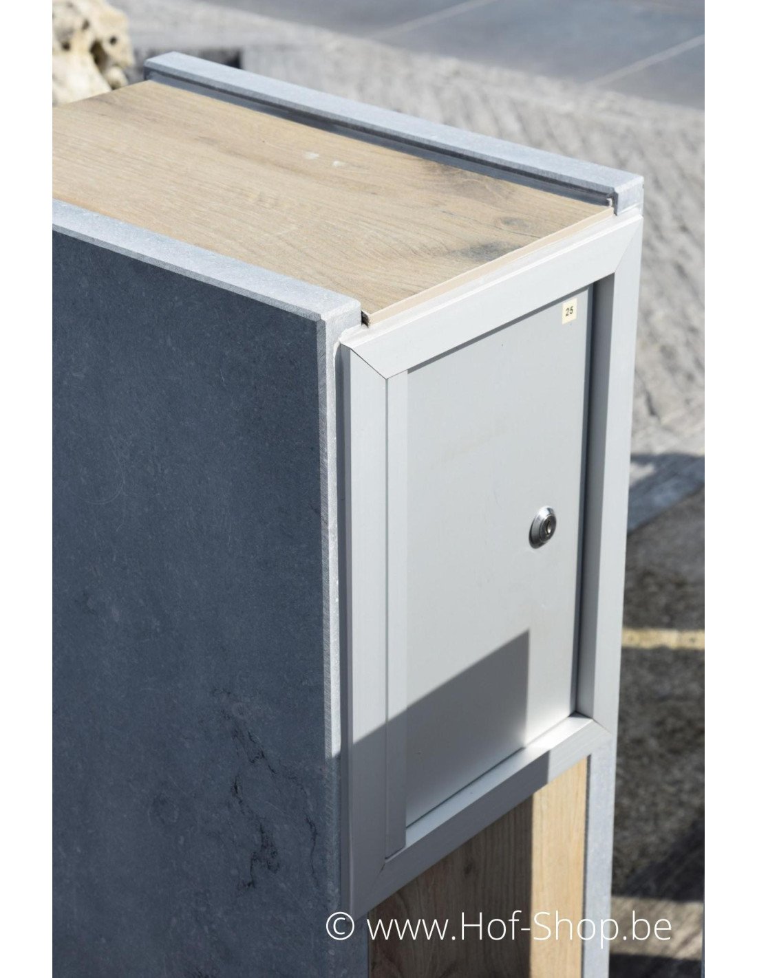 Cette boîte aux lettres à l'aspect bois n'est pas en bois, mais en céramique. En combinaison avec la pierre bleue belge, ces boîtes aux lettres Woodlook ont toujours l'aspect et la sensation d'une véritable boîte aux lettres en bois.