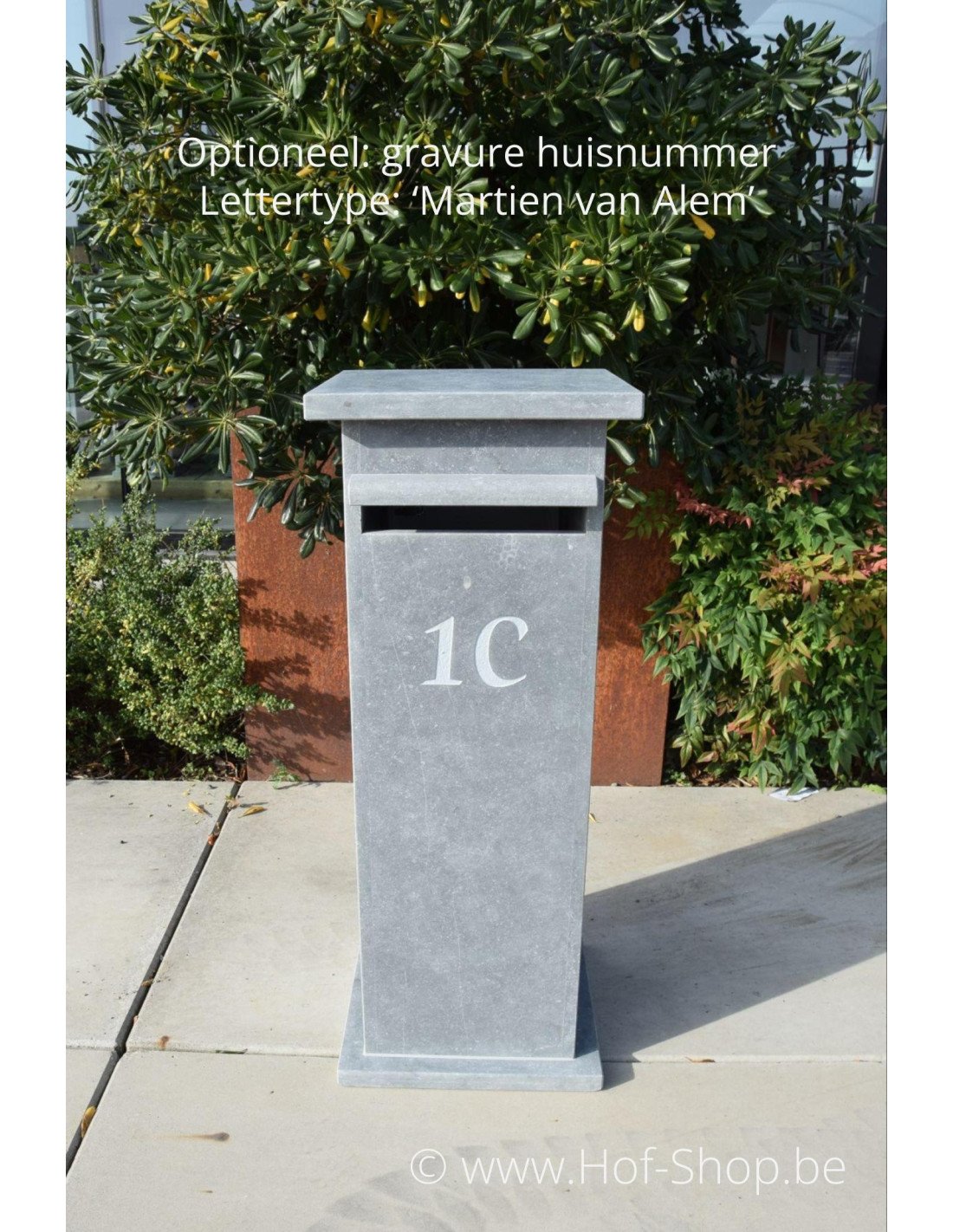 Cette boîte aux lettres autoportante en pierre naturelle V.R. a une belle finition. Elle est fabriquée en pierre bleue belge de haute qualité et est de plus fabriquée à la main en Belgique !
