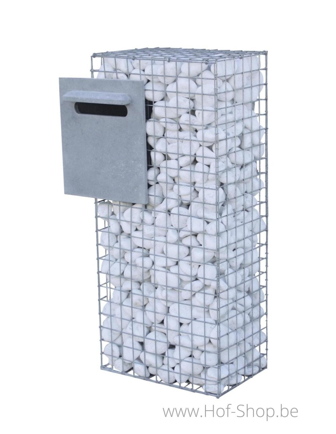 San Antonio est une boîte aux lettres combinée unique composée d'un schanskorf et d'une pierre bleue belge (bluestone). La boîte aux lettres est construite dans un panier en gabion avec des pierres de carrare blanches. La porte est en aluminium.
