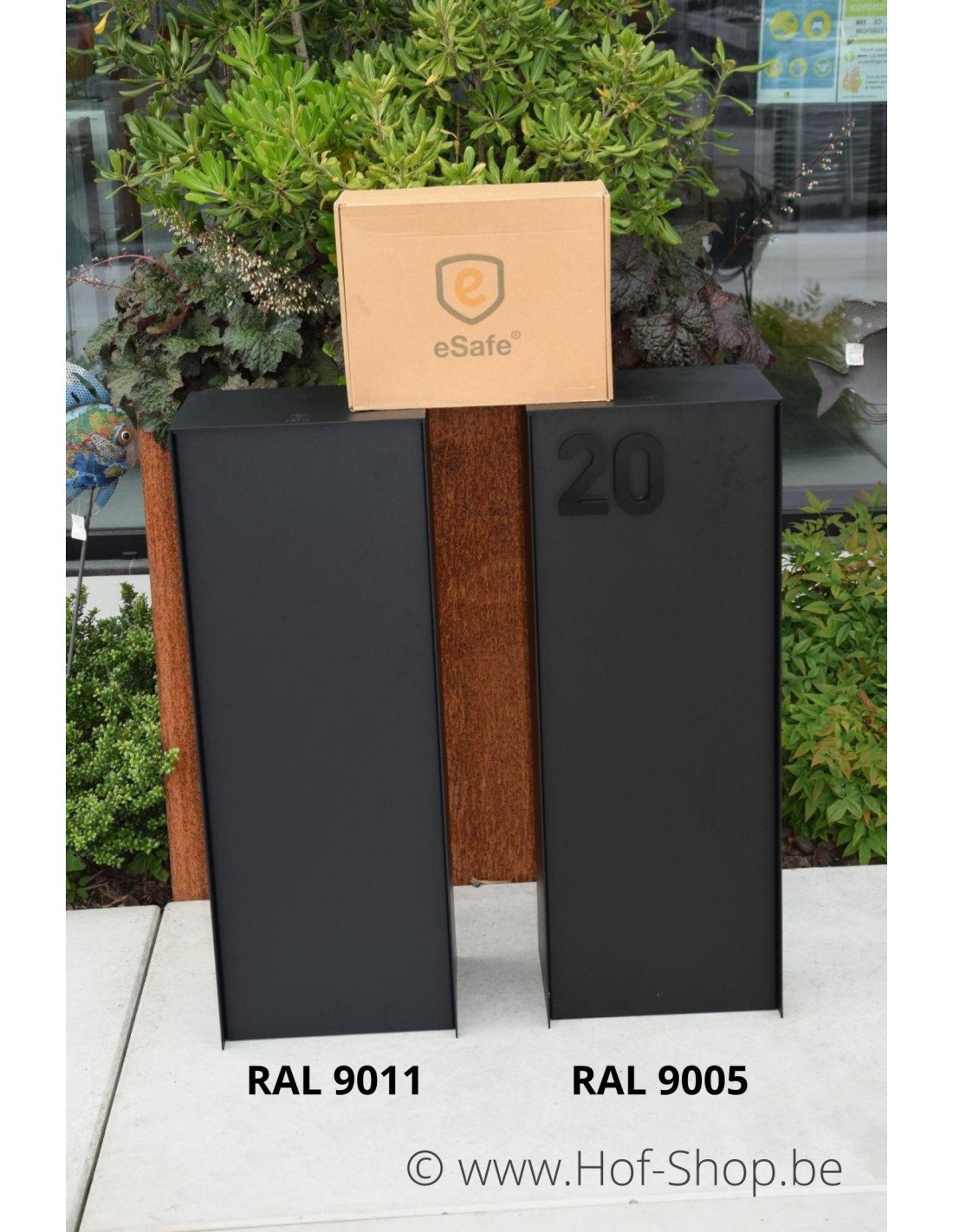 La boîte aux lettres est fabriquée en aluminium inoxydable (3 mm d'épaisseur) avec une peinture texturée de haute qualité (mat RAL 9011 noir graphite). Les boîtes aux lettres eSafe sont testées et approuvées par Bpost! Toutes les couleurs RAL sont possibles. Il suffit de nous le demander.