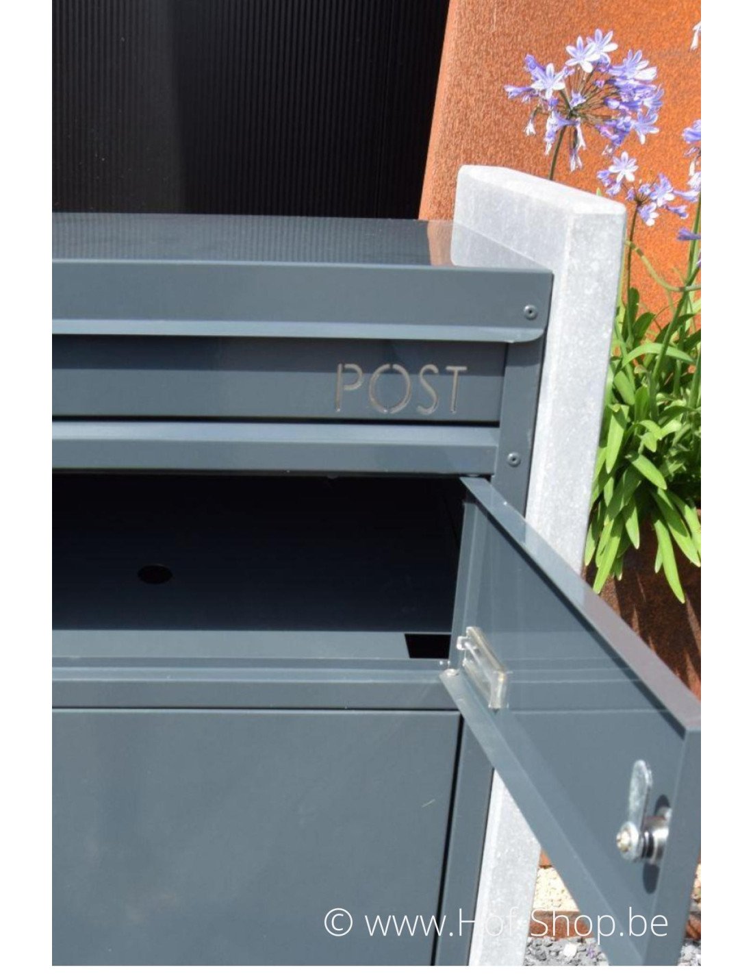 Milano Parcel est une boîte aux lettres élégante qui associe la pierre bleue belge à l'acier thermolaqué. Une boîte aux lettres indépendante idéale si vous n'avez pas beaucoup de place pour la placer (elle s'ouvre par l'avant). Il convient à un paquet de 42 x 38 x 25 cm et a une capacité de 40 litres.