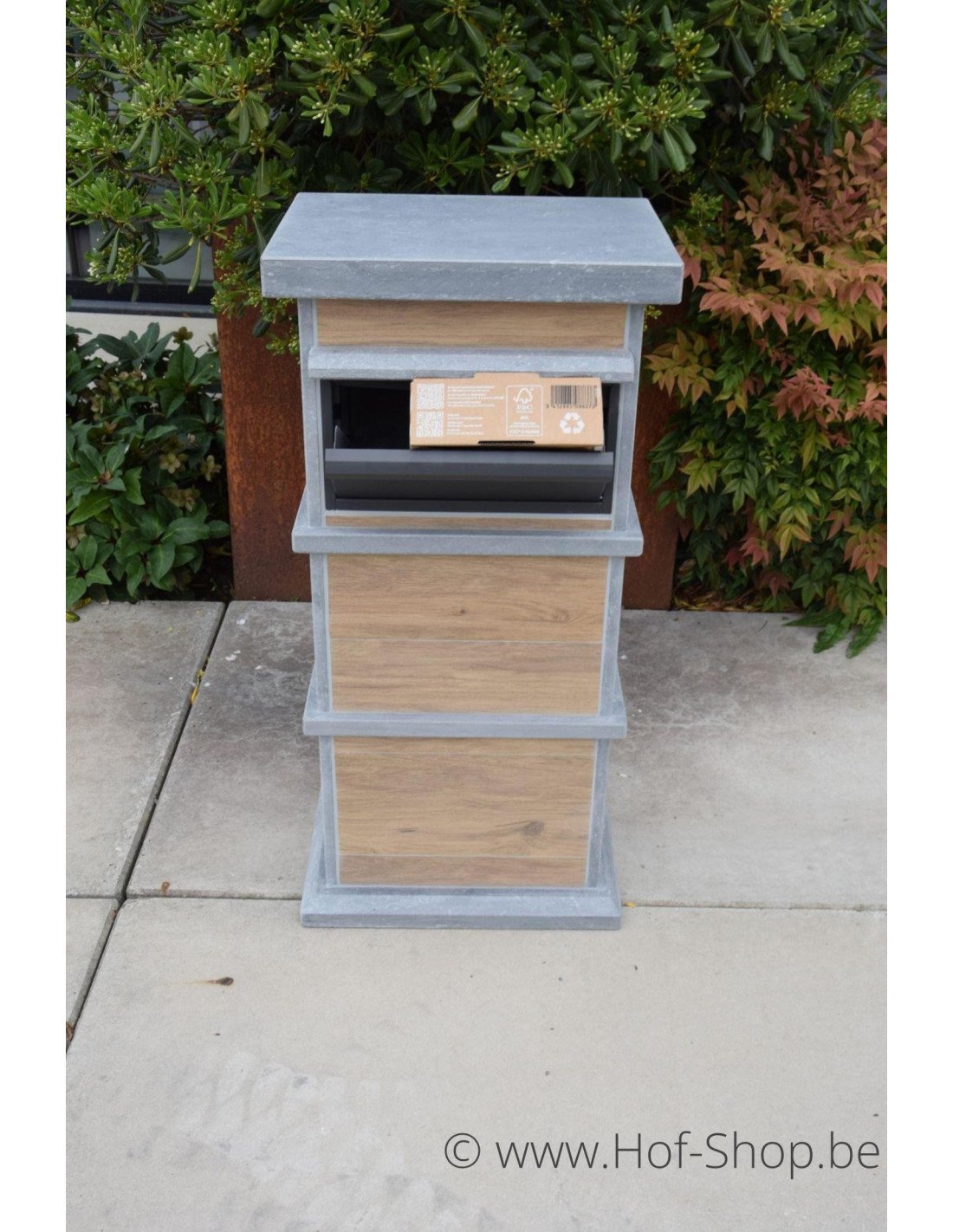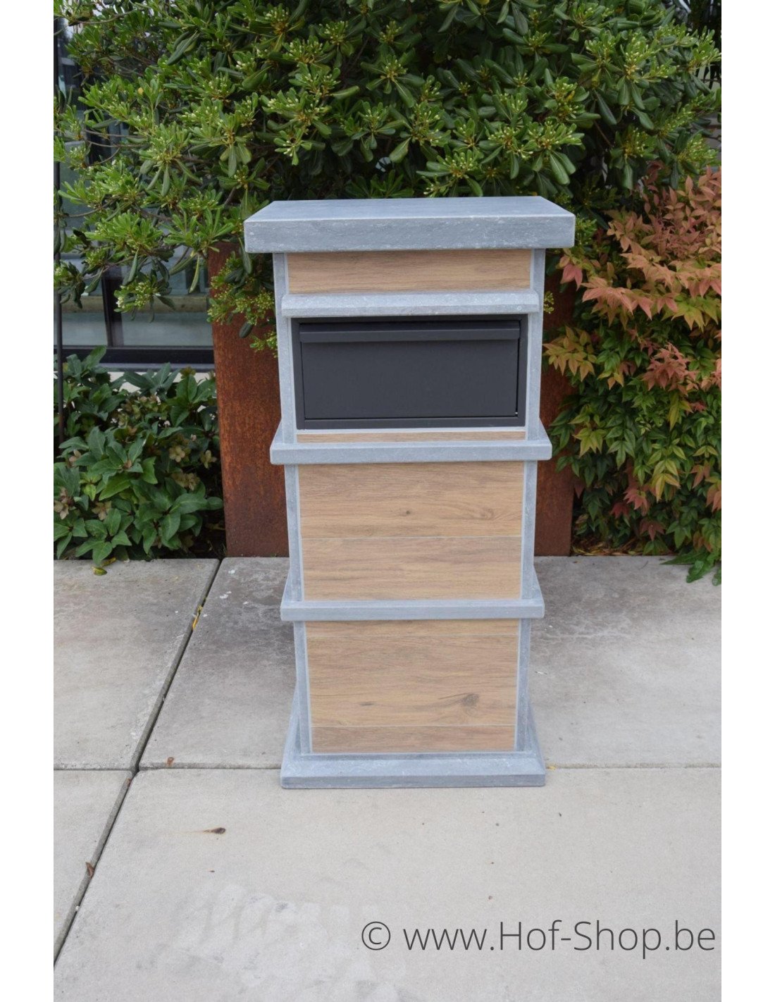 Pamplona Parcel est une boîte aux lettres majestueuse et élégante en pierre bleue belge. La façade est un carreau de céramique à l'aspect bois. L'apparence se distingue à peine du bois véritable.