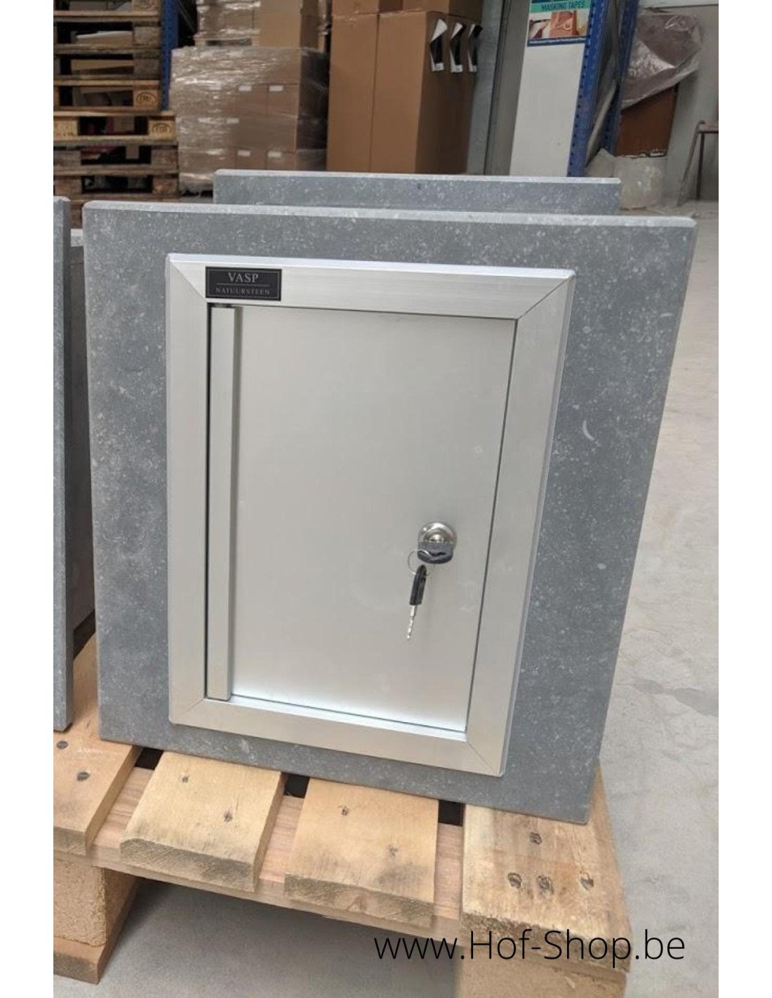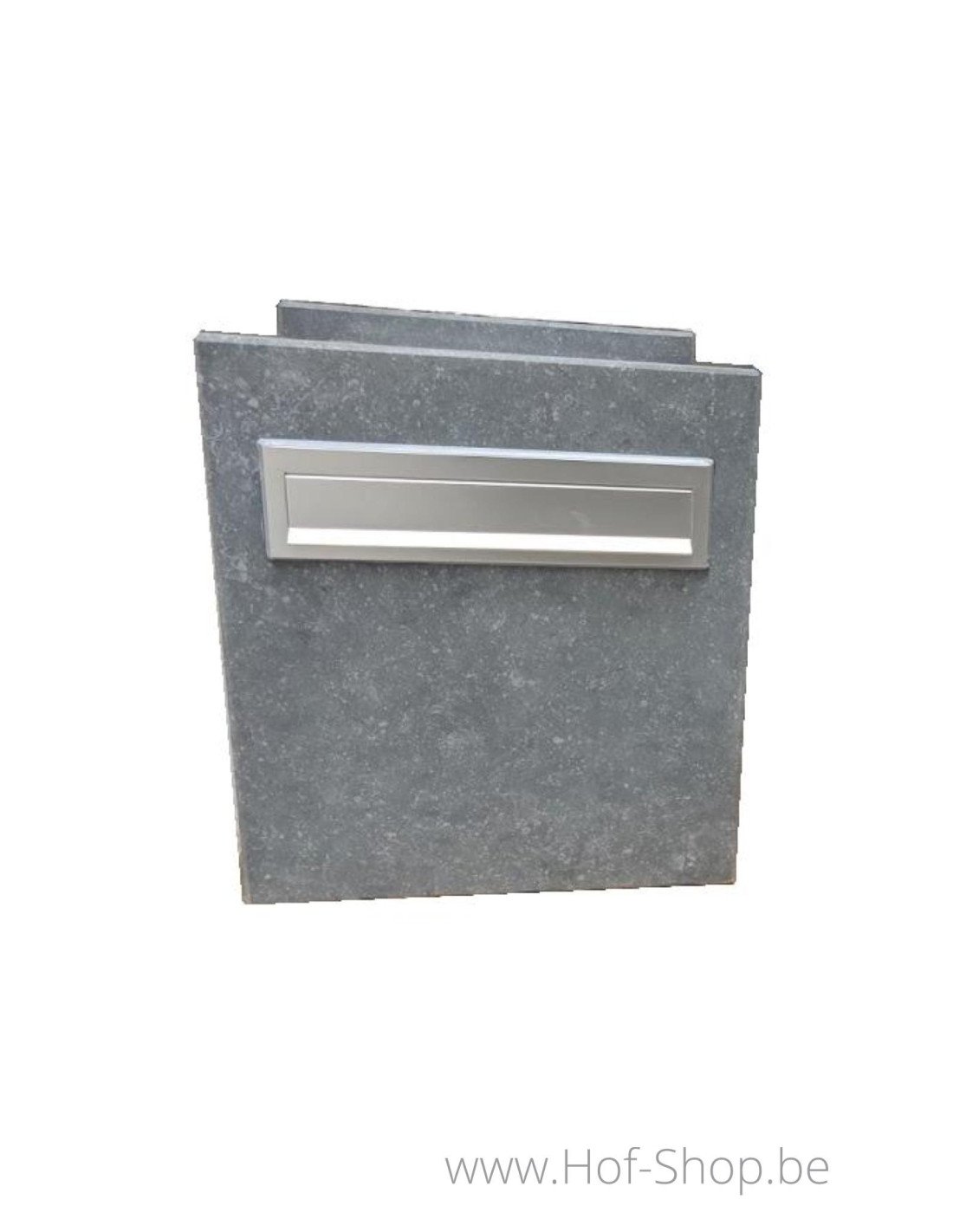 San Diego Box is grote inmetsbrievenbus of inbouwbus uit Belgische blauwe hardsteen. Het deurtje is in aluminium 30 x 34 cm, met twee sleutels. Dankzij de klep in aluminium kan er geen regen binnensijpelen. Ideaal als uw brievenbus gericht is op de slagregen! De opening van de insteekgleuf voldoet aan de postnormen.