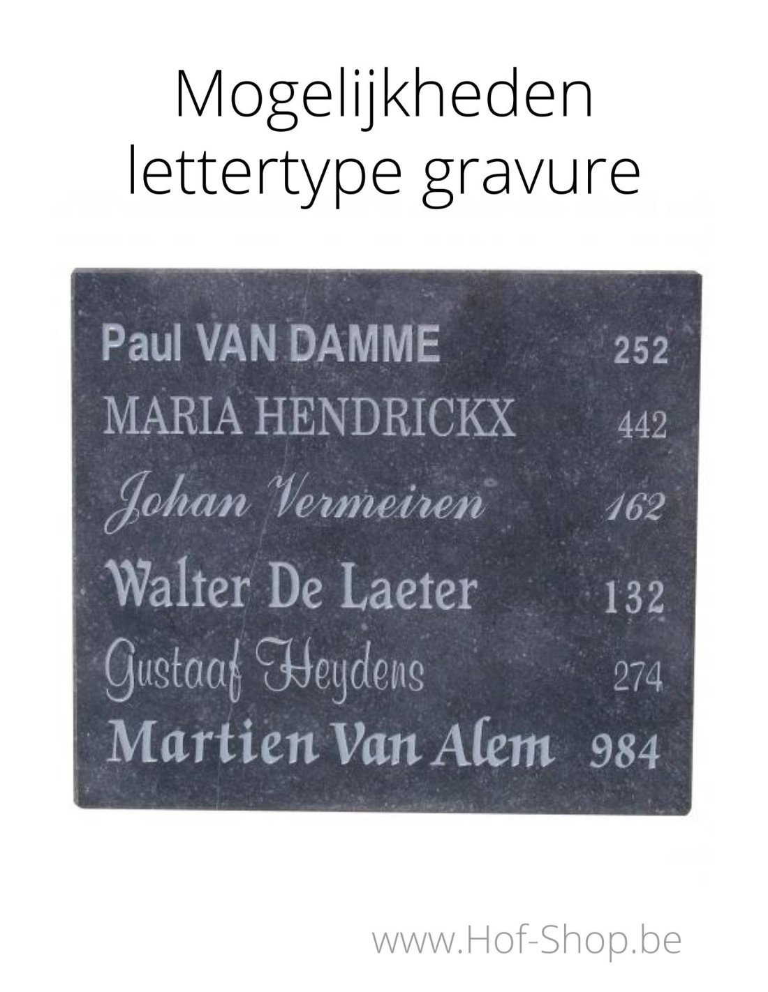 Geef in uw bestelling de juiste nummer mee die gegraveerd moet worden. Maak ook een keuze uit de verschillende lettertypes (foto 1).