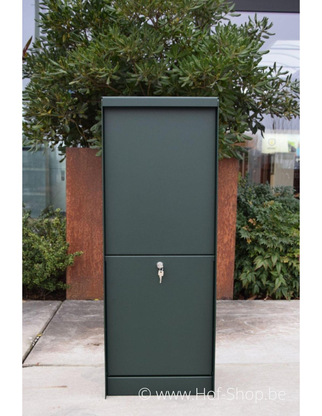Dropbox Small is gemaakt uit 3 mm dik roestvrij aluminium met een unieke structuurlak in de kleur monumentengroen (RAL 6009 mat textuur).