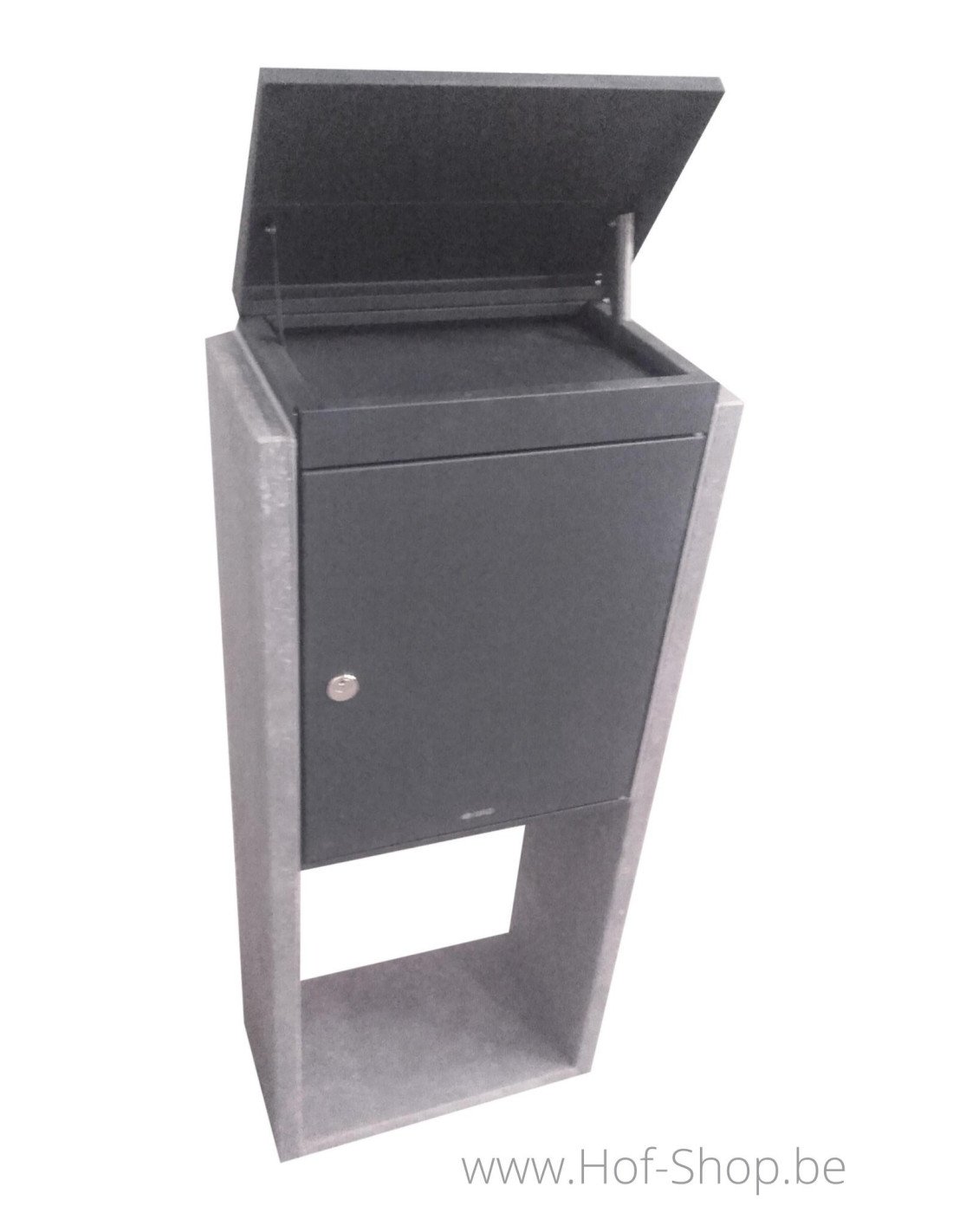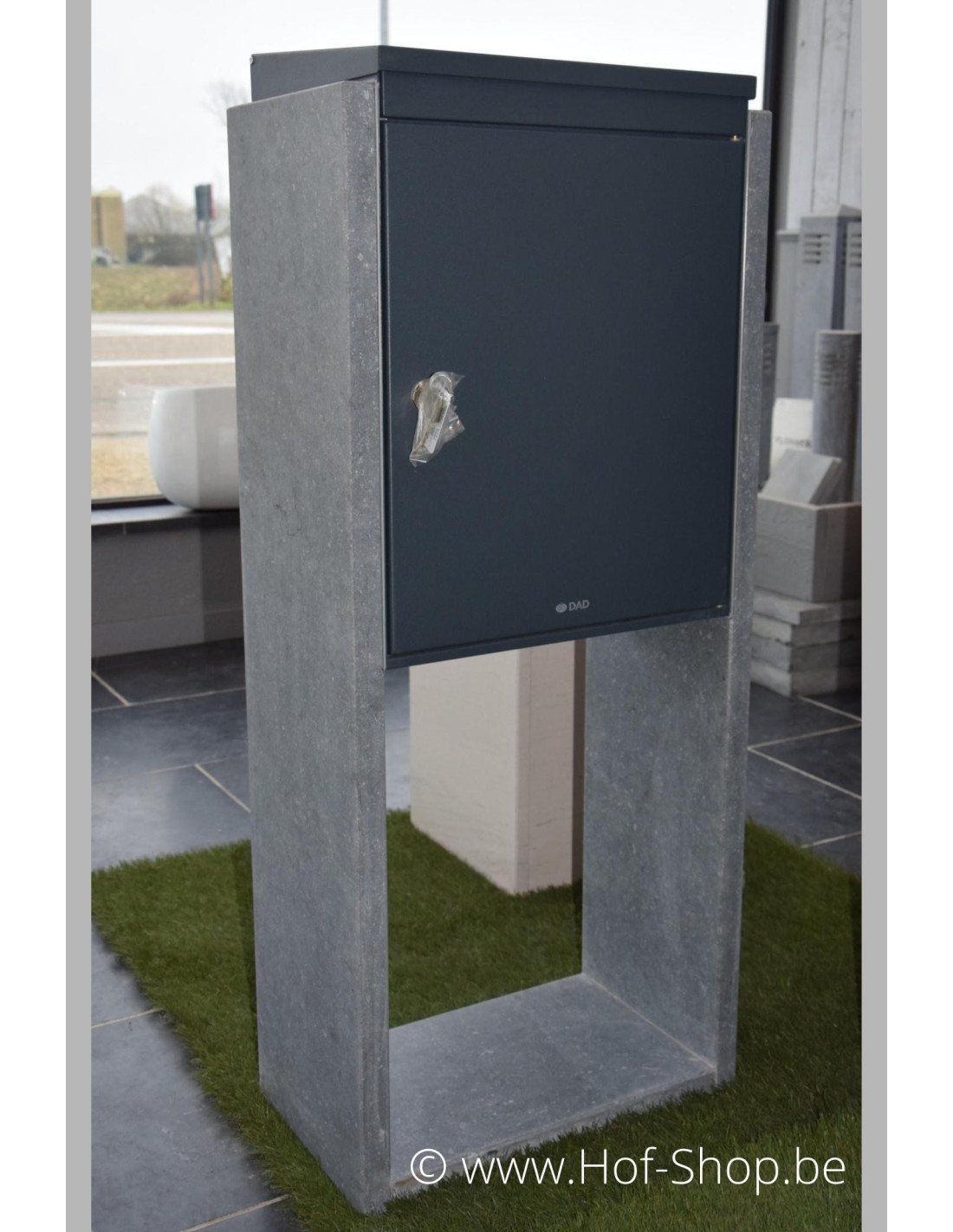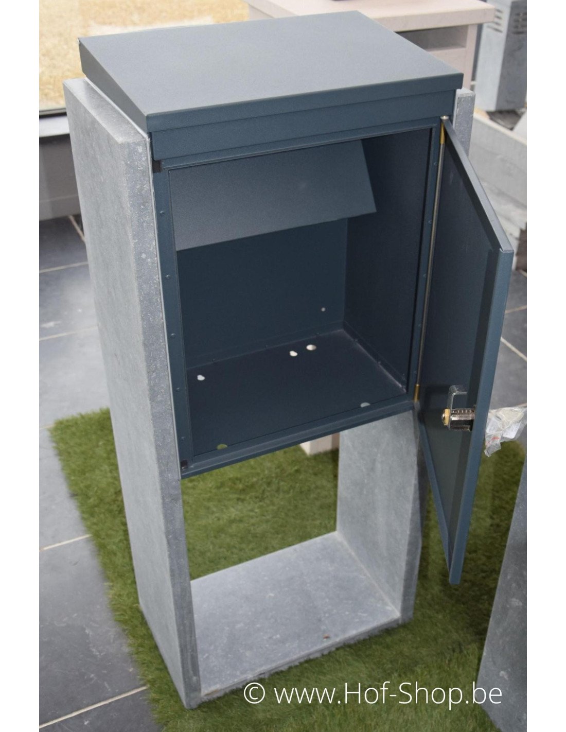 Model O is een tijdloze, stijlvolle postpakket brievenbus uit plaatstaal (gepoedercoated) gecombineerd met Belgische blauwe hardsteen. Deze vrijstaande brievenbus heeft een ruime postbak zodat u grote hoeveelheden post en kleine pakjes kan ontvangen.