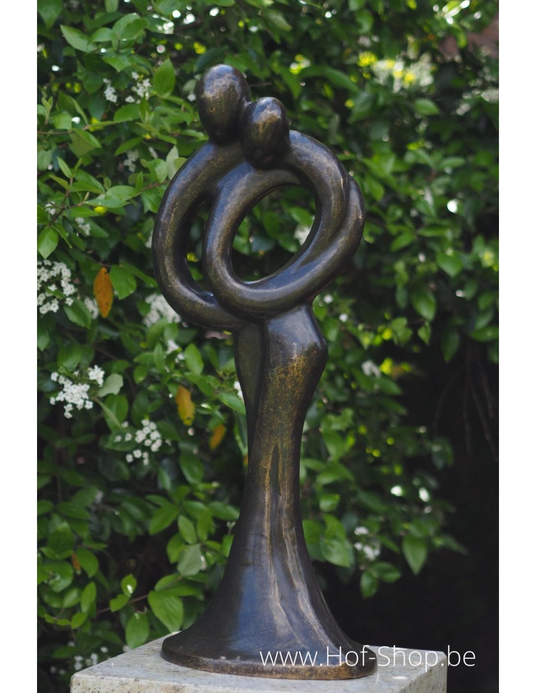 Dit prachtig beeldje van een abstract liefdespaar is een leuke eyecatcher in iedere tuin of interieur. Het beeld heeft een bronsbruine patina en is een perfect huwelijkscadeau.