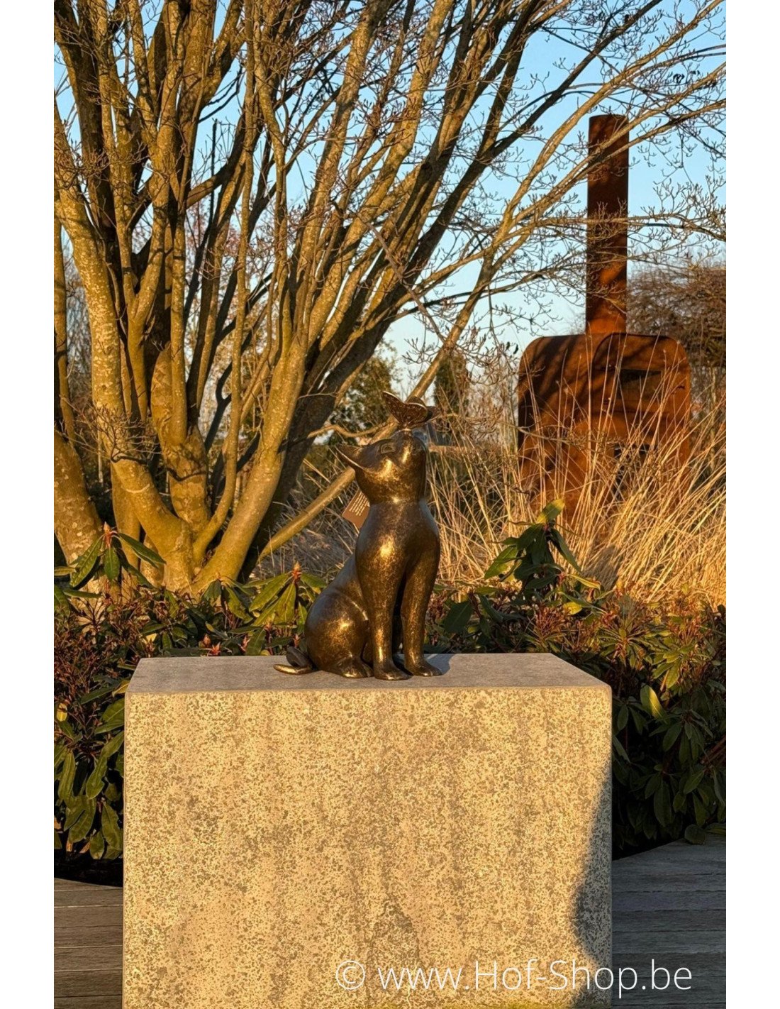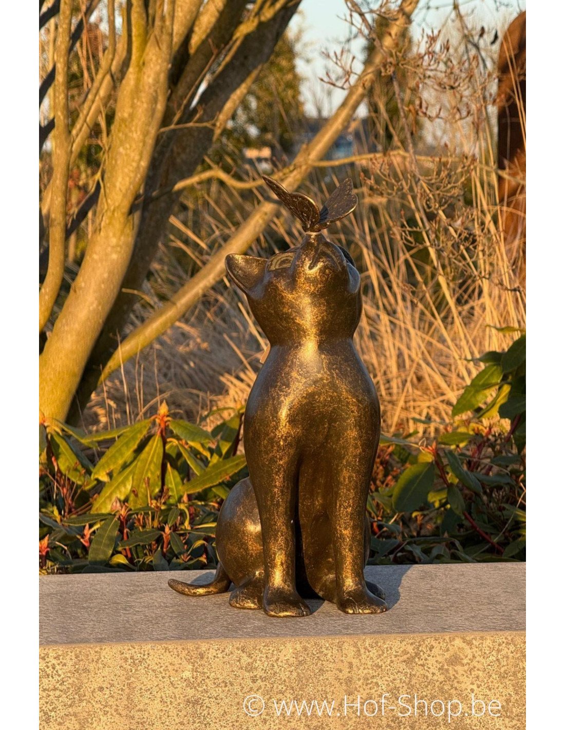 Dit realistische beeldje van een kat met vlinder is een leuke eyecatcher in iedere tuin of interieur. Deze bronzen kat met vlinder heeft een brons bruine patina.