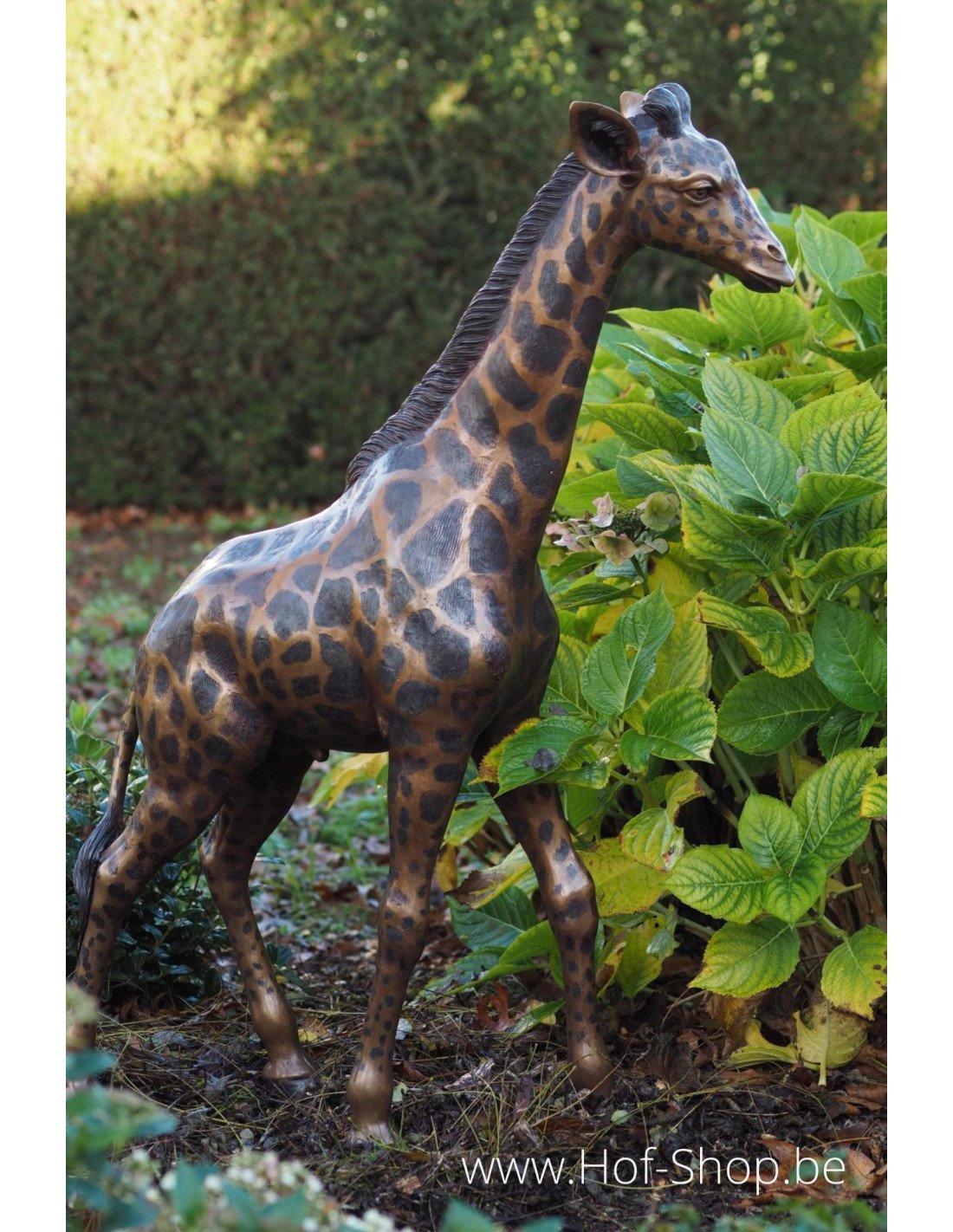 Dit realistische beeldje van een kleine giraf is een ultieme eyecatcher in iedere tuin of interieur. Dit diertje heeft een bronsbruine patina.