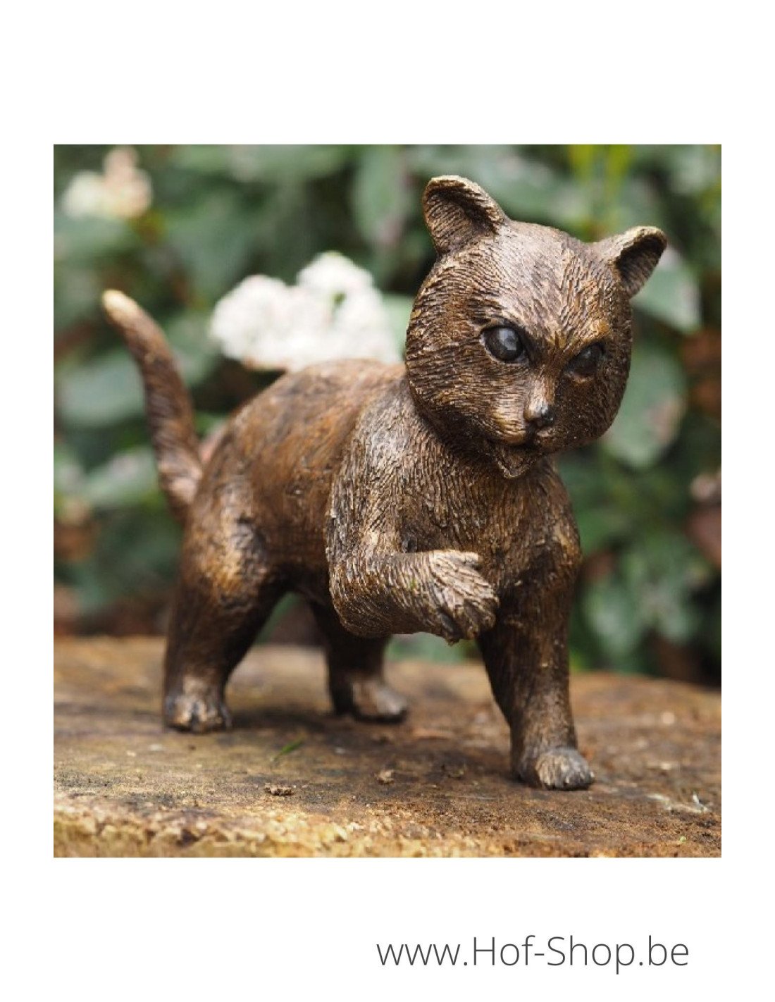 Dit realistische beeldje van een kleine staande kat is een leuke eyecatcher in iedere tuin of interieur. Deze staande kat heeft een bronsbruine patina.