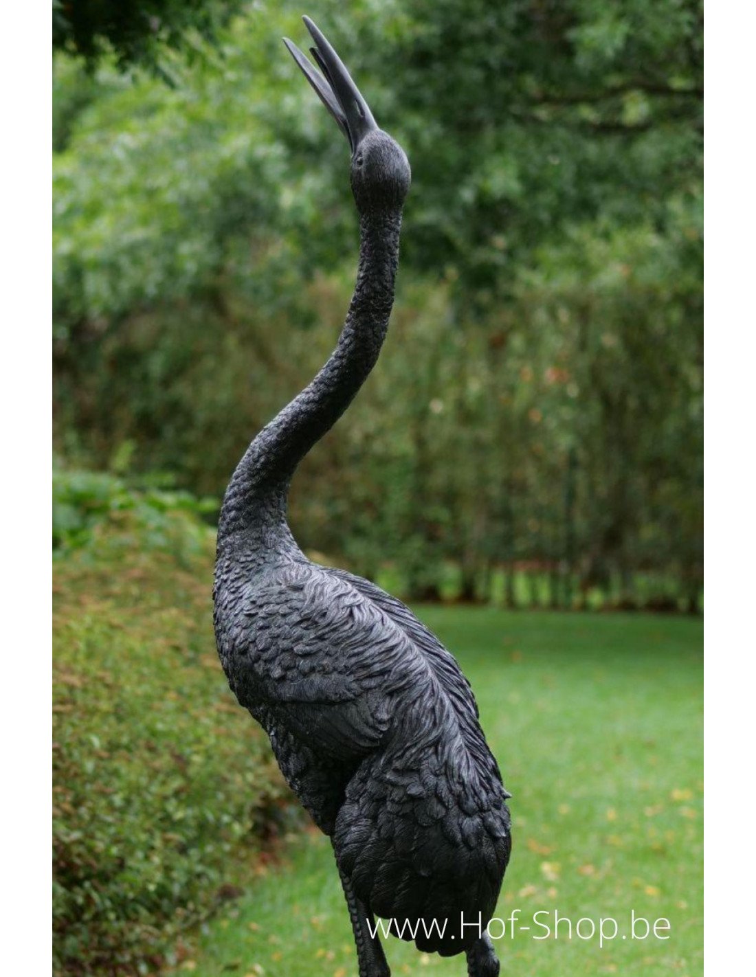 Een mooie bronzen kraanvogel met zijn hoofd omhoog. Uit de bek van deze kraanvogel komt een fontein.