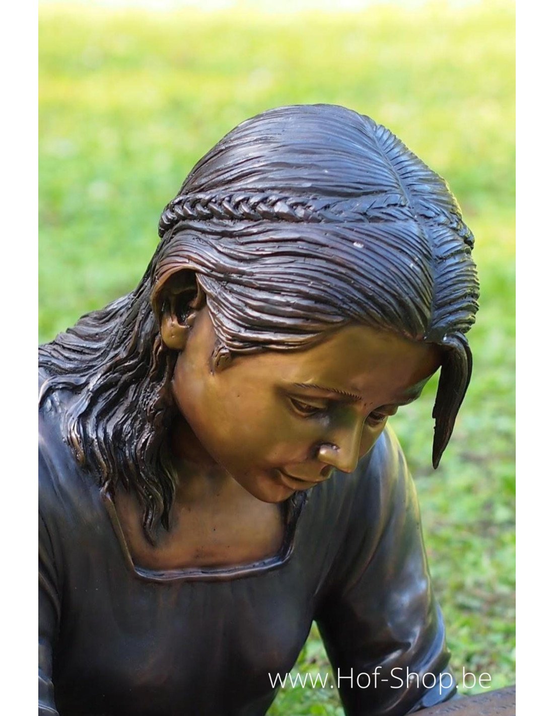 Dit prachtig gedetailleerde beeldje van een liggend lezend meisje is een leuke eyecatcher in iedere tuin of interieur. Het kindje heeft een bronsbruine patina.