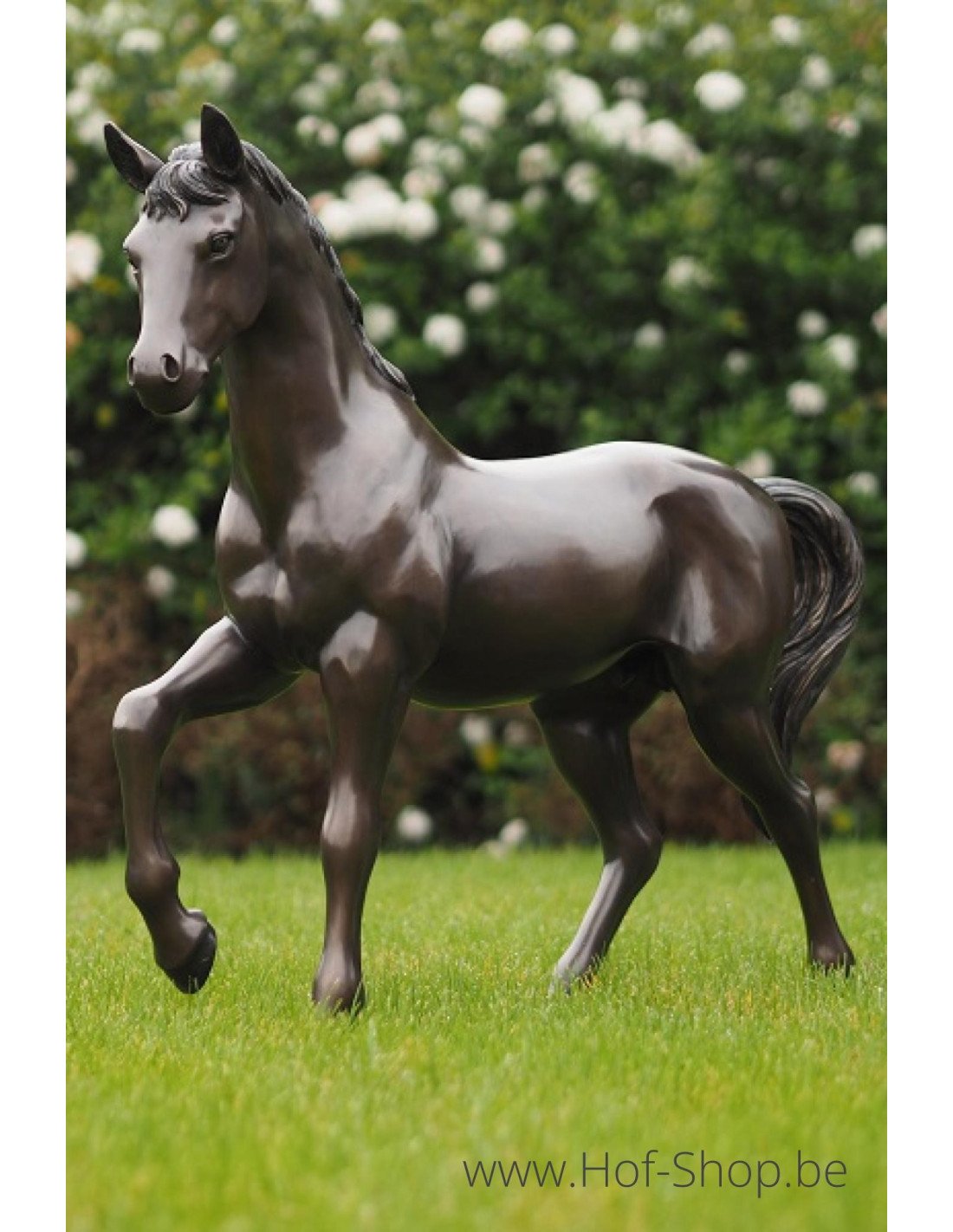 Dit levensechte bronzen beeld van een paard (veulen) is een mooie verschijning in een grote tuin.