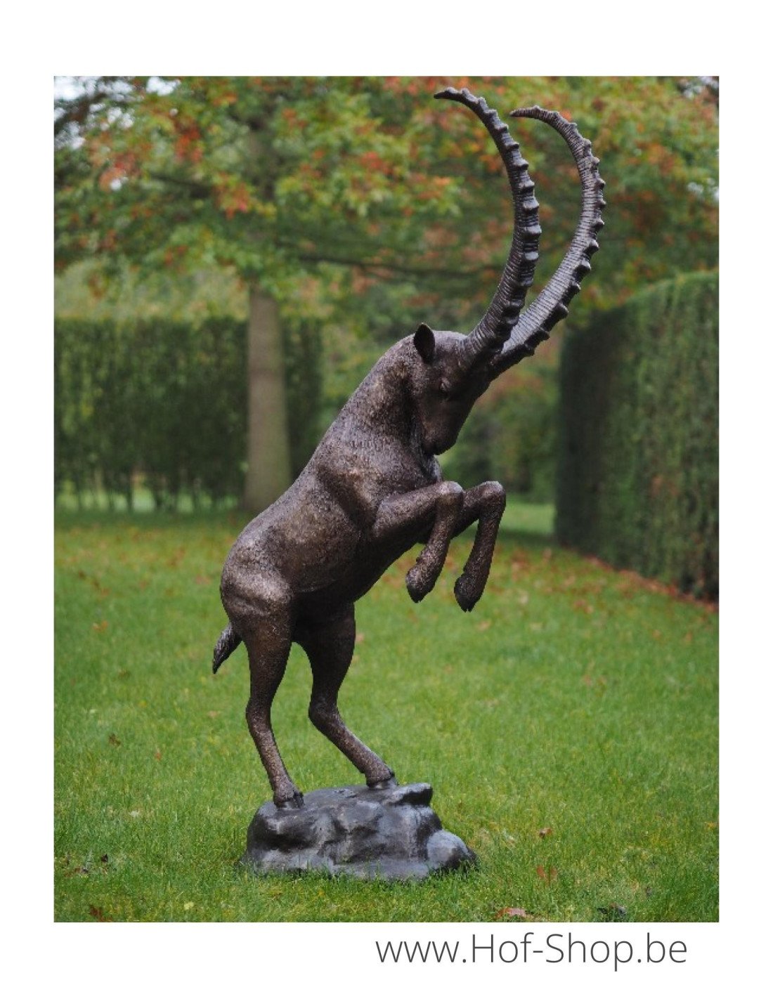 Dit levensechte beeld van een steenbok in brons is een mooie verschijning in iedere tuin. Zijn bronzen hoorns zijn indrukwekkend.
