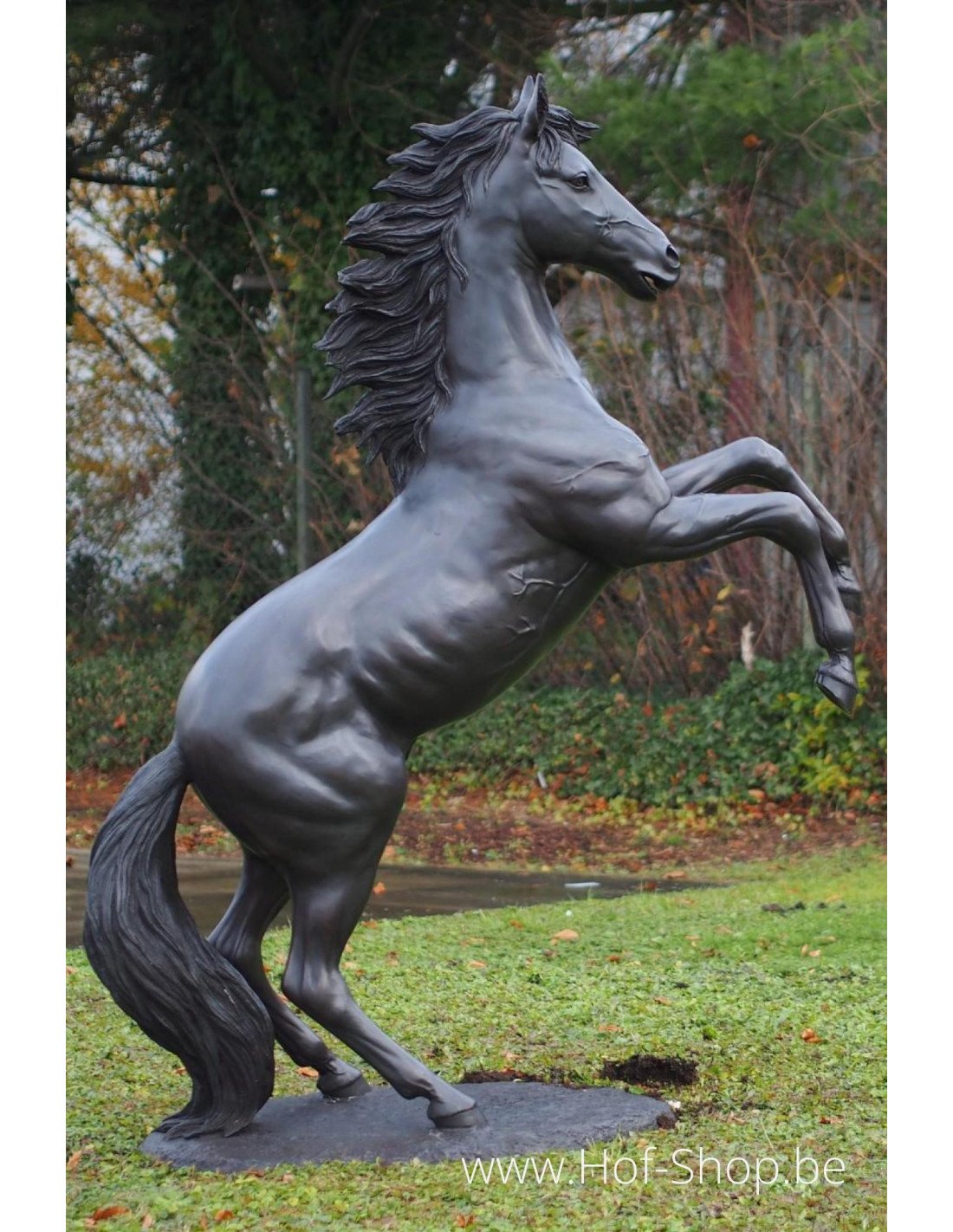 Dit levensechte bronzen beeld van een paard is een mooie verschijning in een grote tuin. Daarnaast leent deze bronzen sculptuur zich ideaal als eye-catcher op een manege of paardenfokkerij.