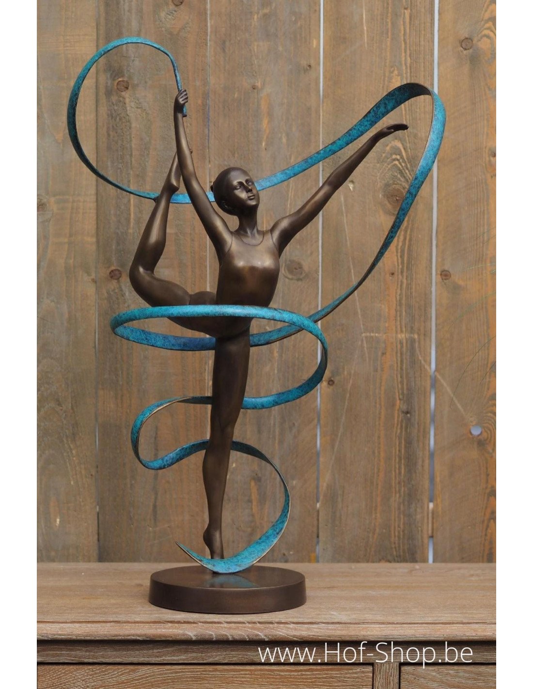 Dit prachtig gedetailleerde beeldje van een turnster met lint is een leuke eyecatcher in iedere tuin of interieur. De vrouw heeft een bronsbruine patina met groen lint.