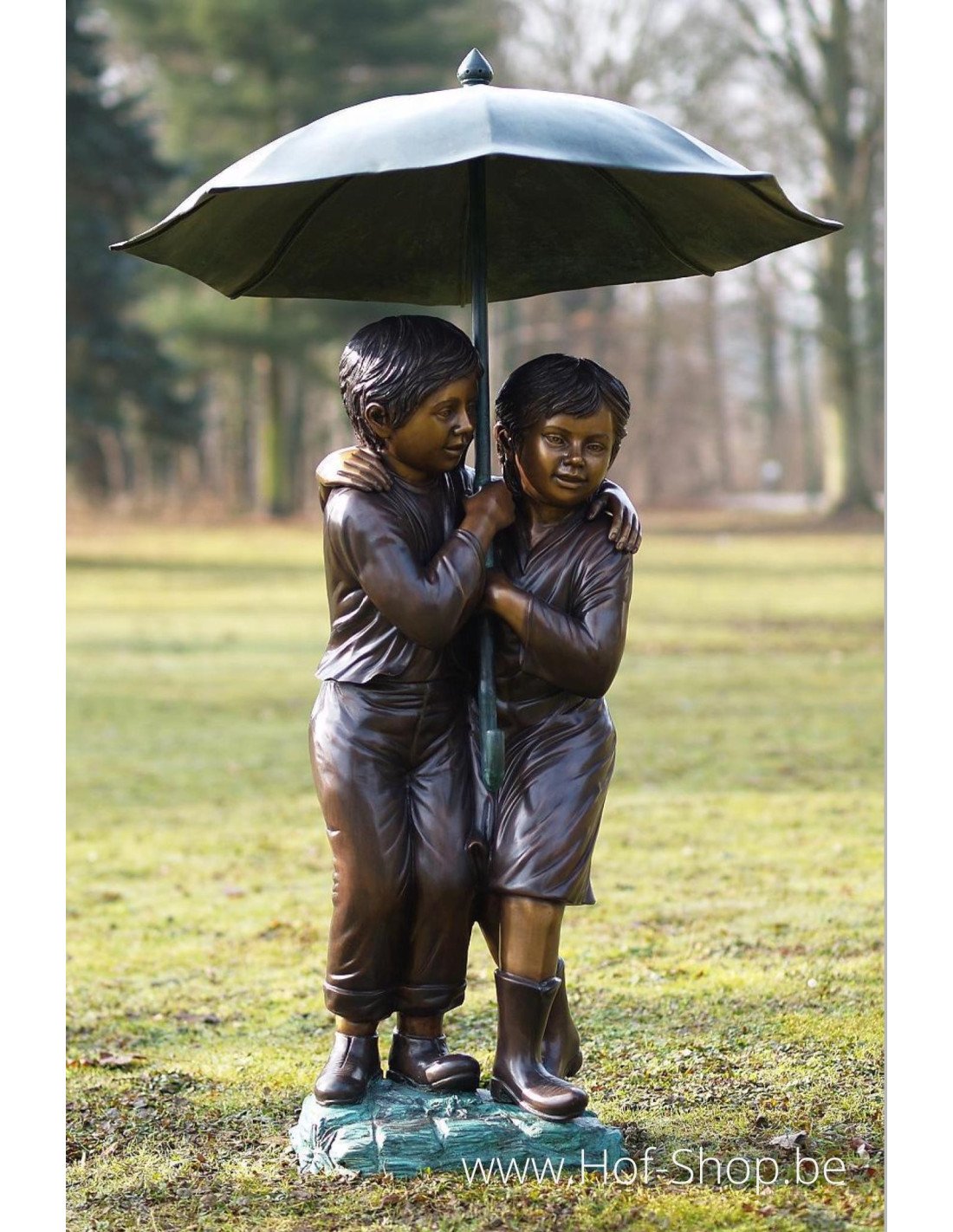 Dit mooie beeld van twee kinderen onder een paraplu is een leuke eyecatcher in iedere tuin of interieur. Het beeld heeft een bronsbruine patina met groene accenten.