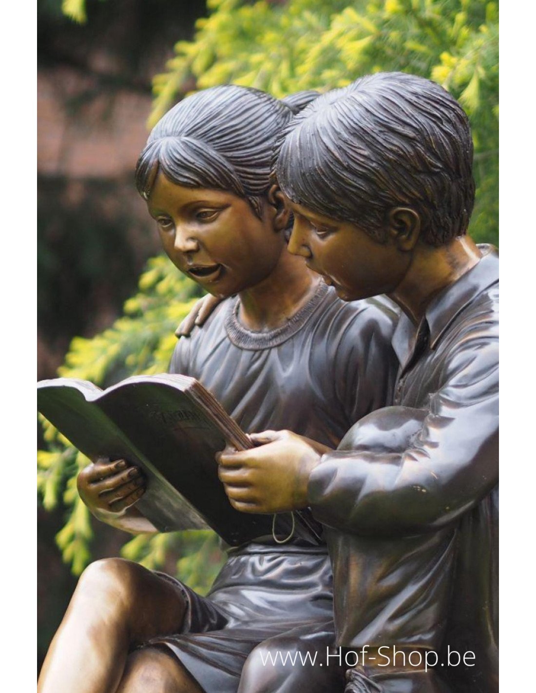 Prachtige bronzen kinderen (jongen en meisje) die samen een boek lezen.