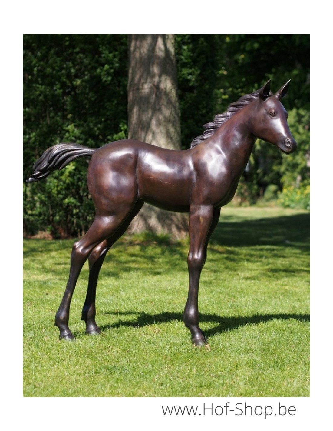 Dit levensechte bronzen beeld van een veulen is een mooie verschijning in een grote tuin.