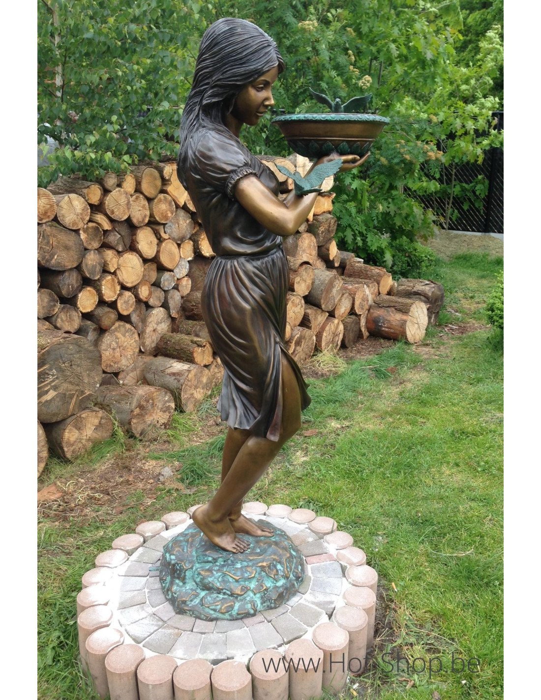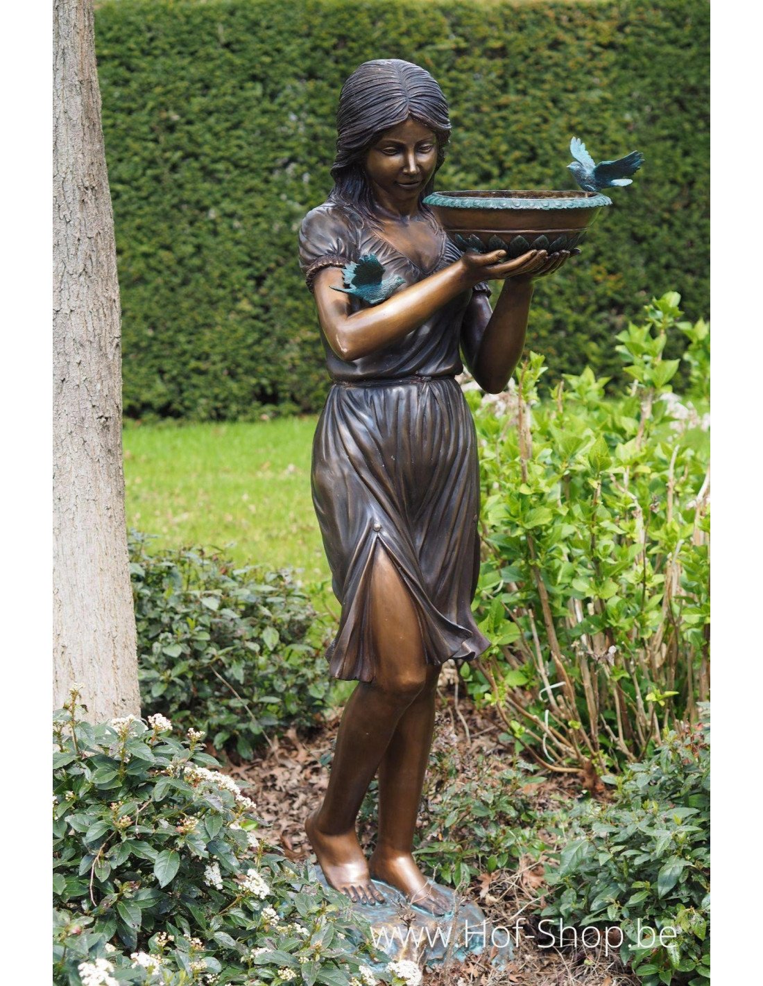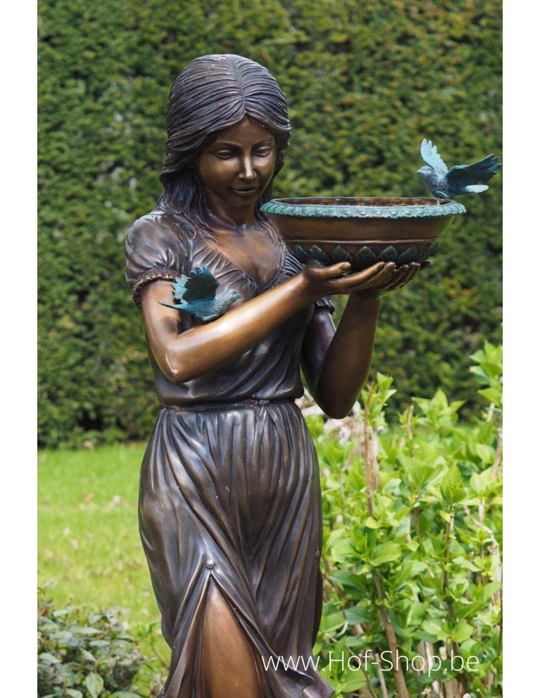 Een mooie bronzen vrouw met een waterschaal. Deze tuinsculptuur is bovendien, dankzij de waterschaal, ideaal om de vogeltjes in de tuin water te geven.