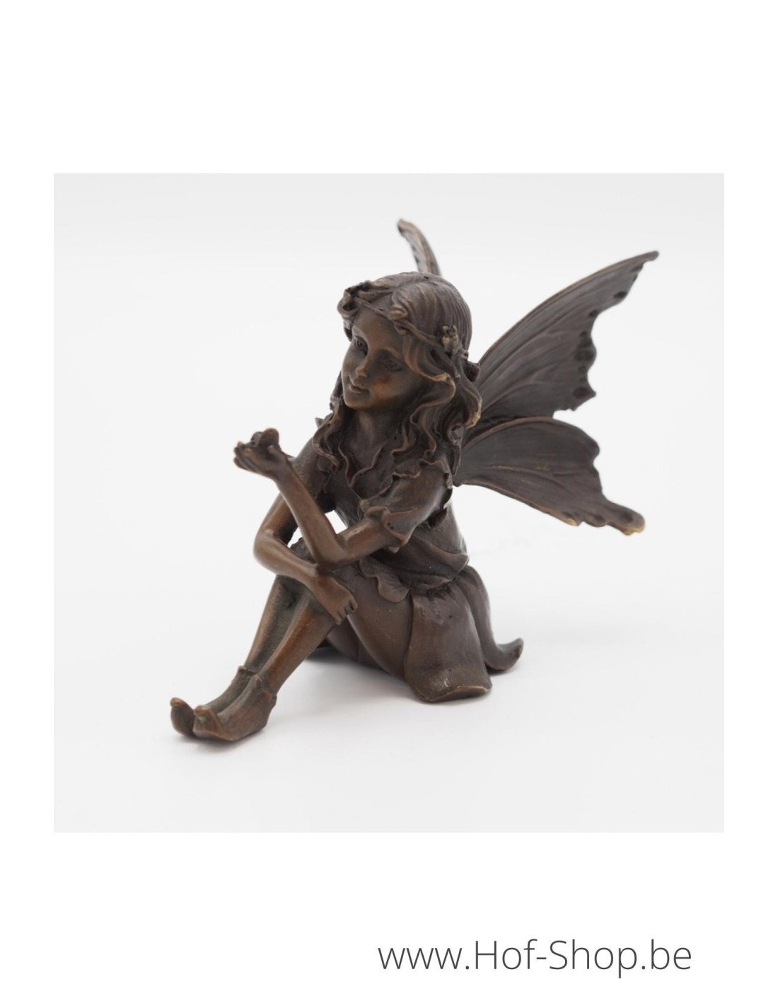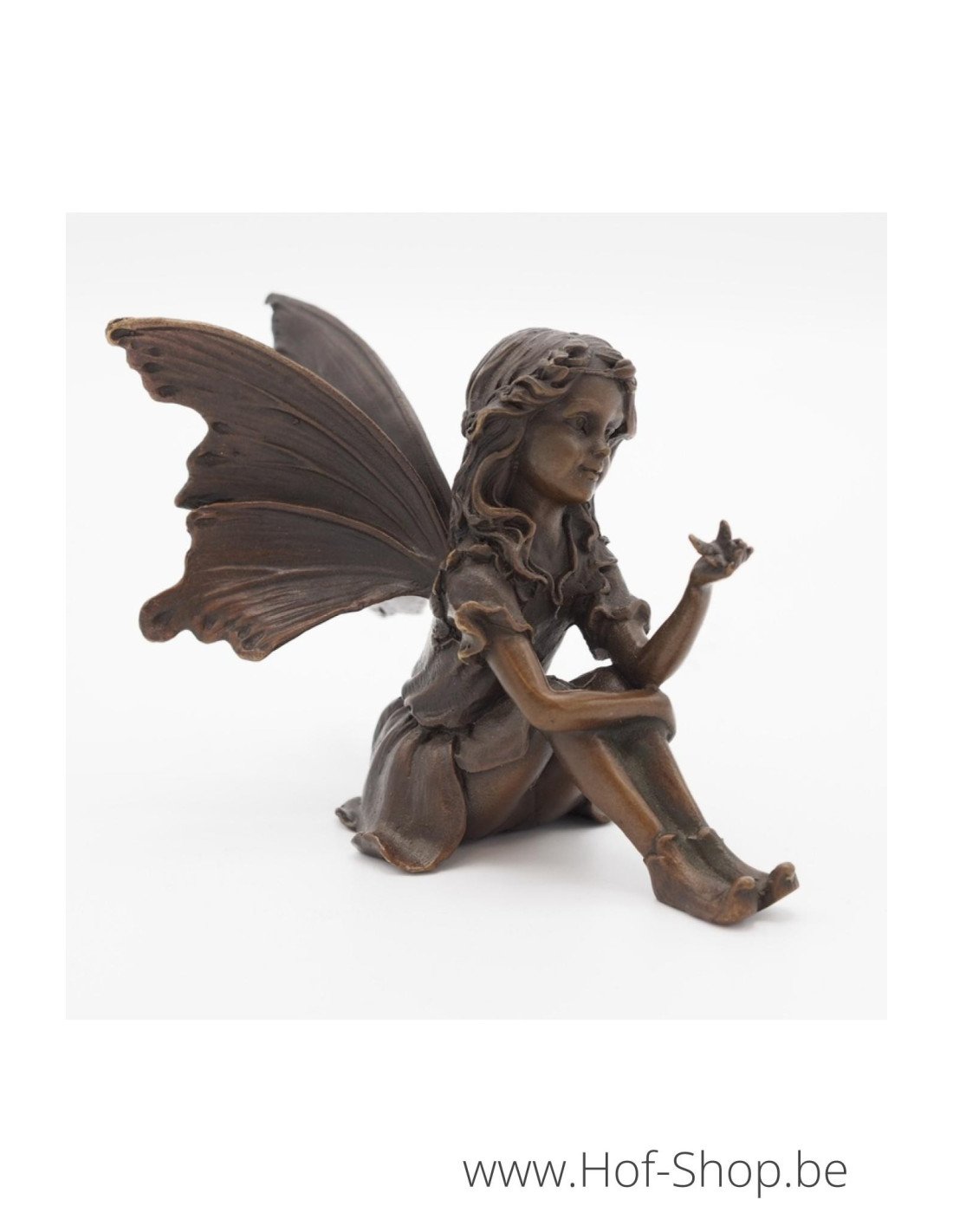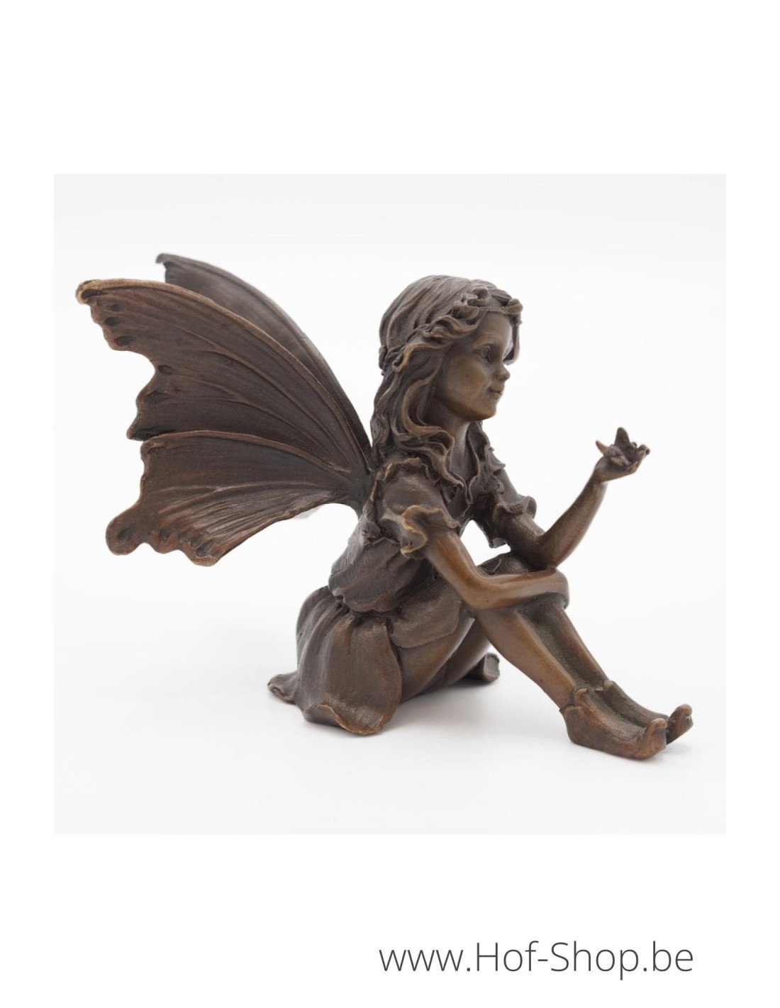 Een mooi bronzen beeld van een zittende elf die een vlinder in haar hand heeft. Dit kan in de tuin staan, bijvoorbeeld op een sokkel in natuursteen, maar evengoed binnen in huis.