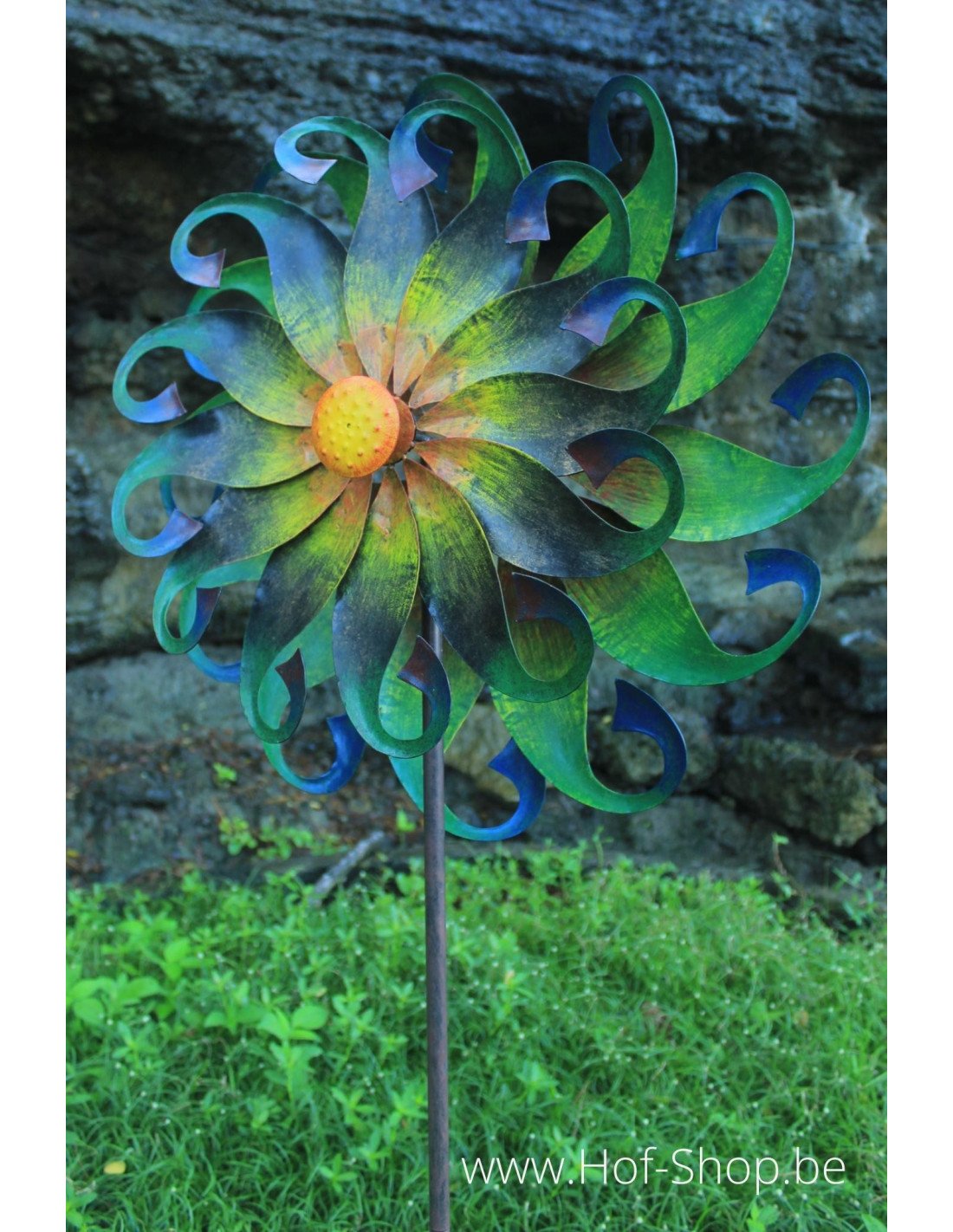 Een mooie gekleurde bloem die ronddraait in de wind. Ideaal om tussen de planten of in een bloembak te steken.